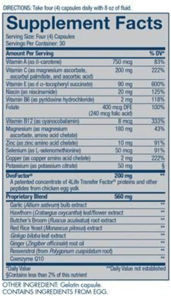 DESCRIPTION : 4Life Transfer Factor Cardio - Targeted System Support Dietary Supplement with Ginkgo Biloba, Garlic, Red Yeast Rice, and Resveratrol - 120 Capsules