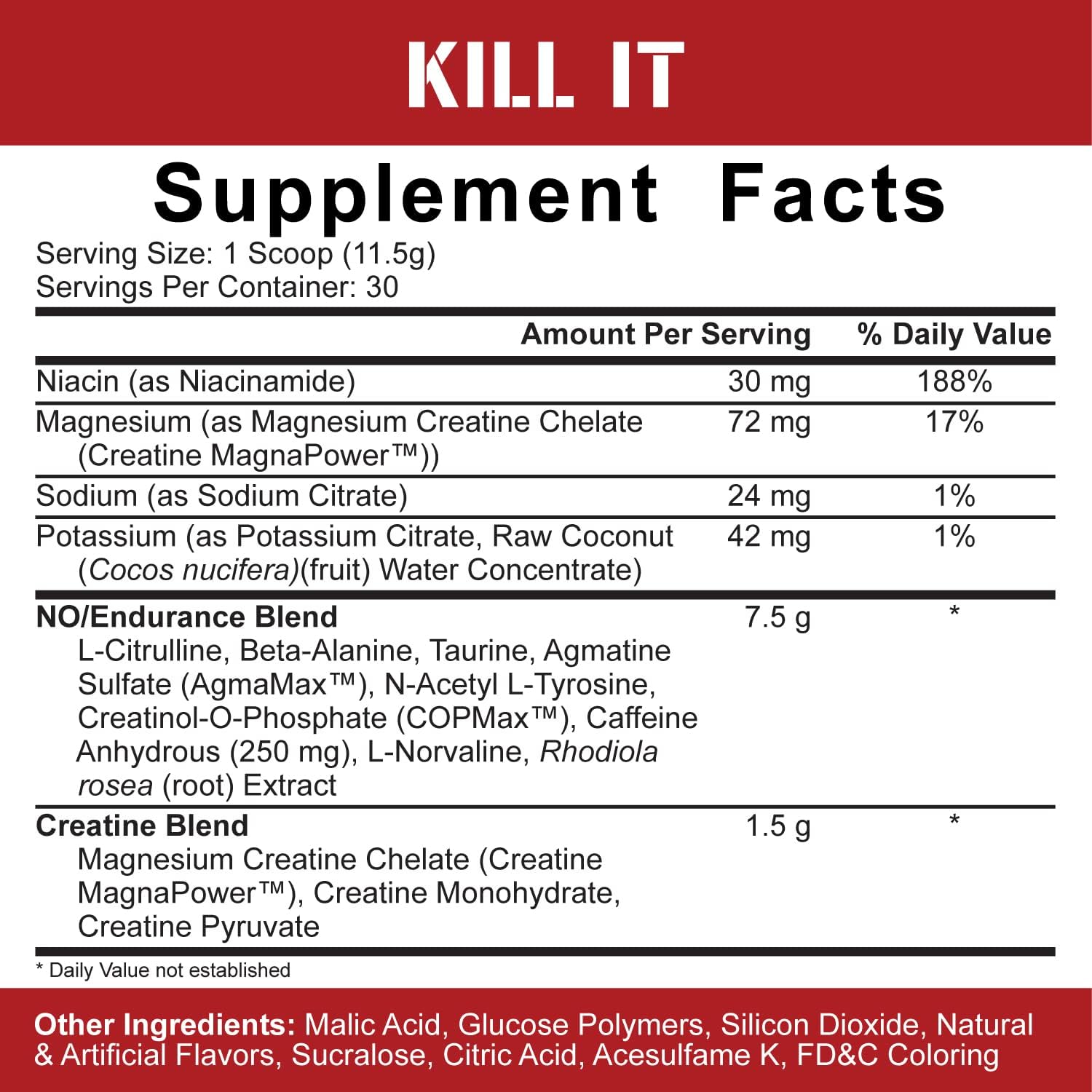 BULLET POINTS : 1 > FOCUSED ENERGY, POWER, & PUMPS: KILL IT combines neural enhancers with a moderate dose of jitter-free caffeine, creatine, and pump supplements for athletes who want fewer stimulants while retaining the superior performance benefits of 5% elite formulations