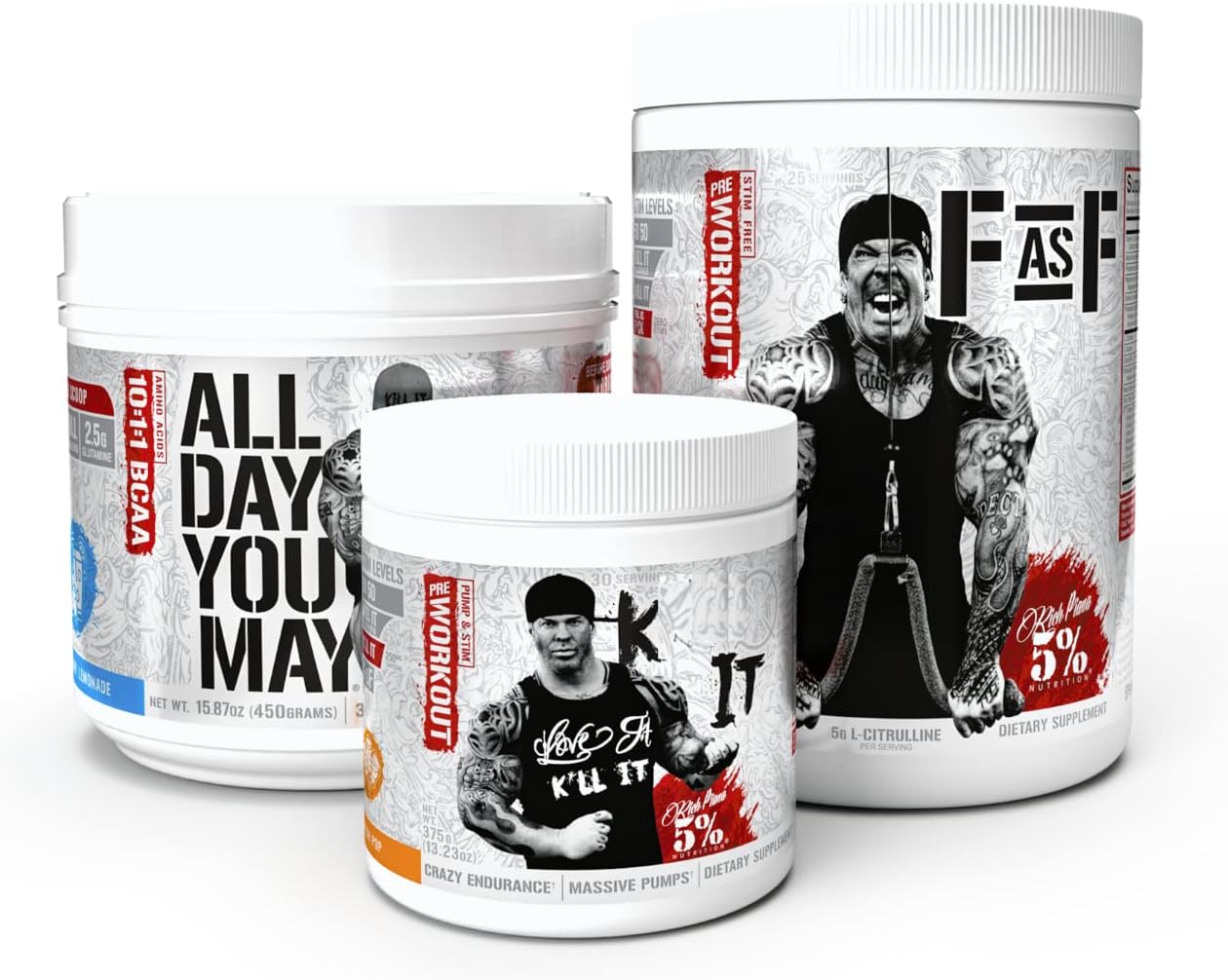 DESCRIPTION : 5% Nutrition 3-Stack (Kill It Pre-Workout + FasF Pre-Workout + AllDayYouMay BCAA Powder)