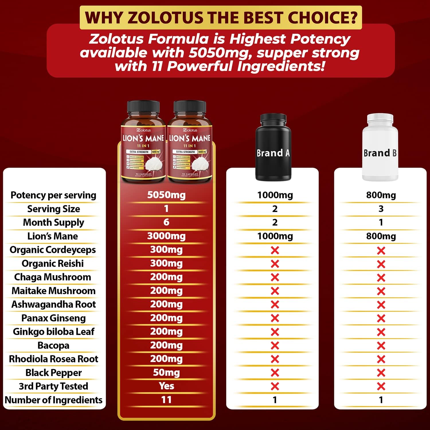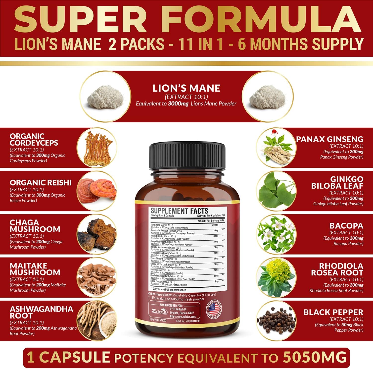 11 In 1 : Zolotus Lions Mane Supplements Included Lions Mane, Cordeyceps, Reishi, Chaga Mushroom, Maitake Mushroom, Panax Ginseng, Ashwagandha, Ginkgo Biloba, Bacopa, Rhodiola Rosea, Black Pepper. These Powerful Ingredients Will Help You Many Many Health Benefits