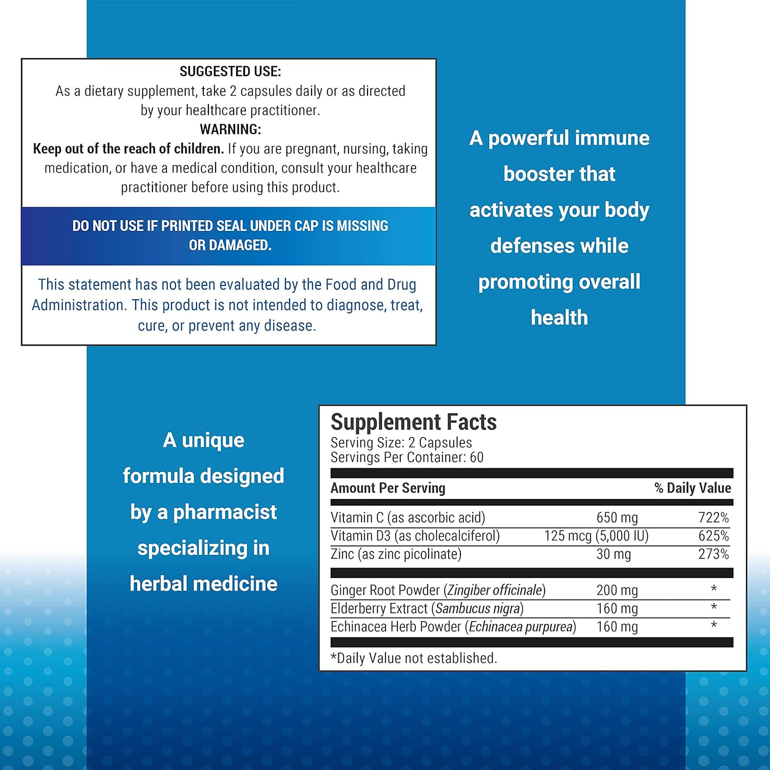 ?? POWERFUL IMMUNE BOOSTER: a blend of Black Elderberry, Echinacea, Ginger Root, Vitamin C, Vitamin D3 and Zinc Picolinate?? POWERFUL ANTIOXIDANTS: Elderberry, Echinacea, Ginger Root and Vitamin C strengthens your body’s natural defenses by providing you with plentiful antioxidant support?? VITAMIN D3: The sunshine vitamin is not produced naturally by your body and can only be obtained through food and supplements. Vitamin D3 plays a crucial role in providing immune support, teeth and bone health, promote healthy muscle function and is essential for overall health?? ZINC PICOLINATE is a highly bioavailable form of zinc, which is best absorbed by the body. Besides being critical for the development and function of immune cells, zinc is crucial for the activity of several hundreds of enzymes that are necessary for metabolism, nerve function and senses of taste and smell?? QUALITY YOU CAN TRUST: This unique formula DESIGNED BY A PHARMACIST SPECIALIZING IN HERBAL MEDICINE to provide highest potency and bioavailability. Unlike standard immune formulas we spared no expense to source the highest quality ingredients. MADE IN THE USA: Our formula is NATURAL, ALLERGEN-FREE, GLUTEN-FREE, and made in a facility following strict GMP guidelines to ensure safety and quality