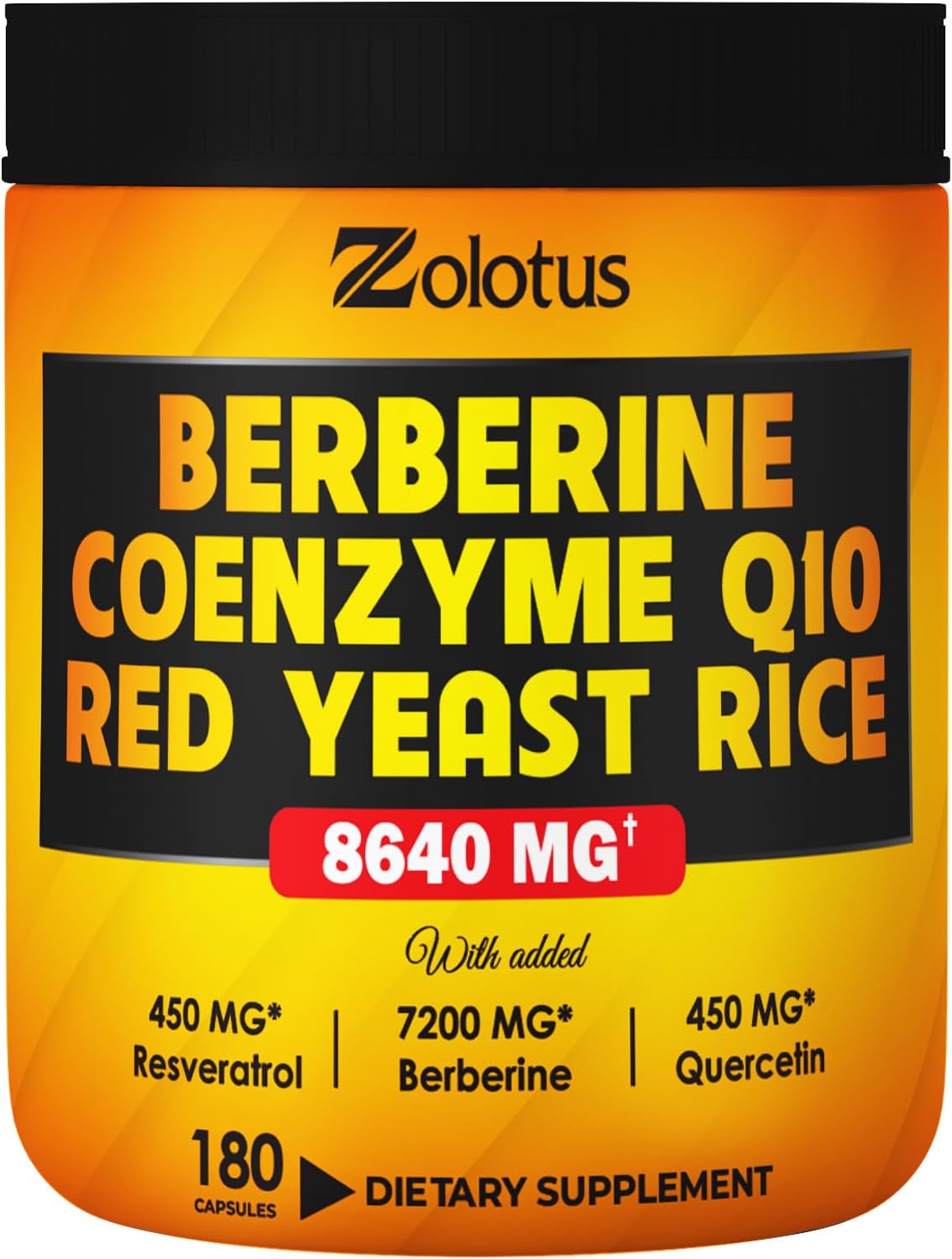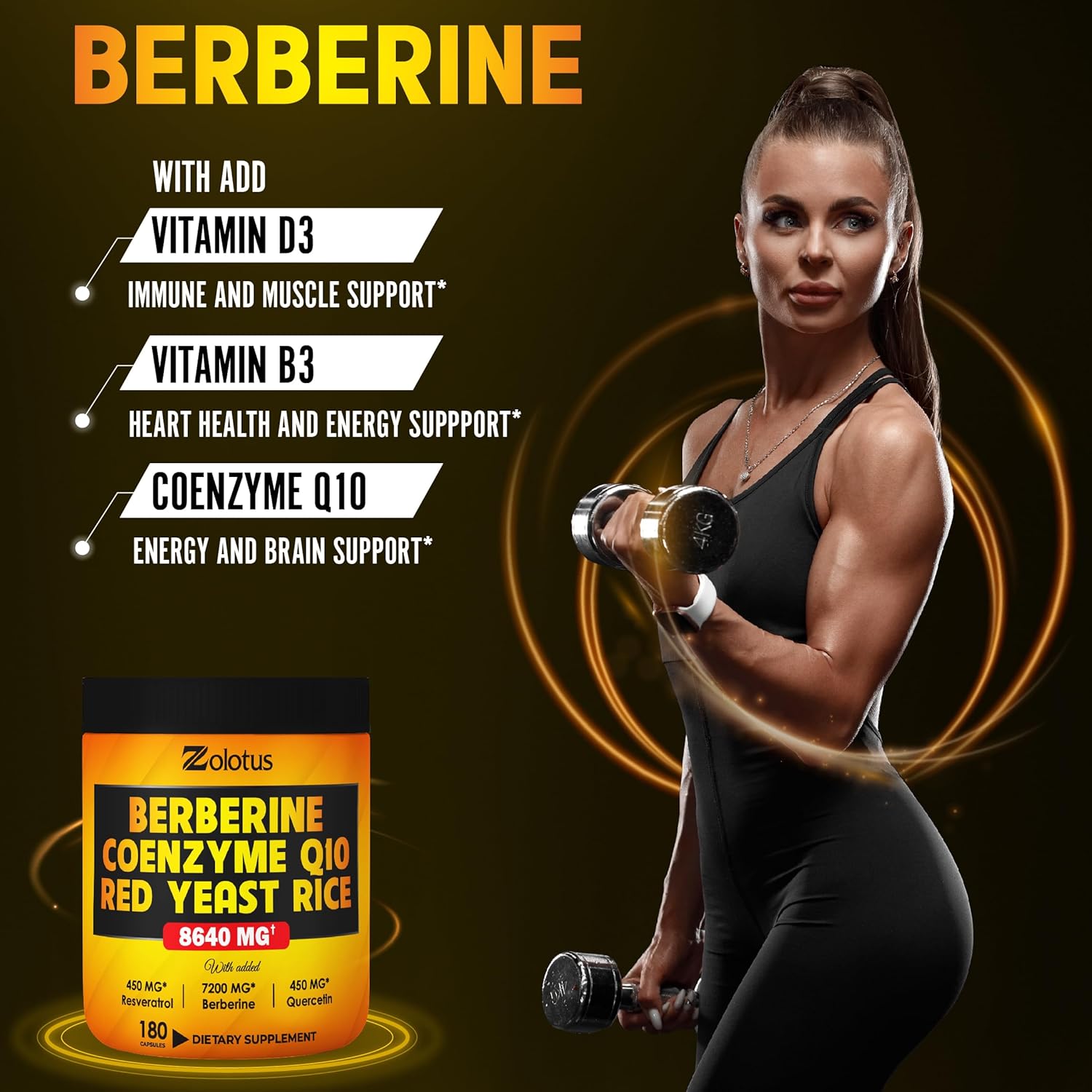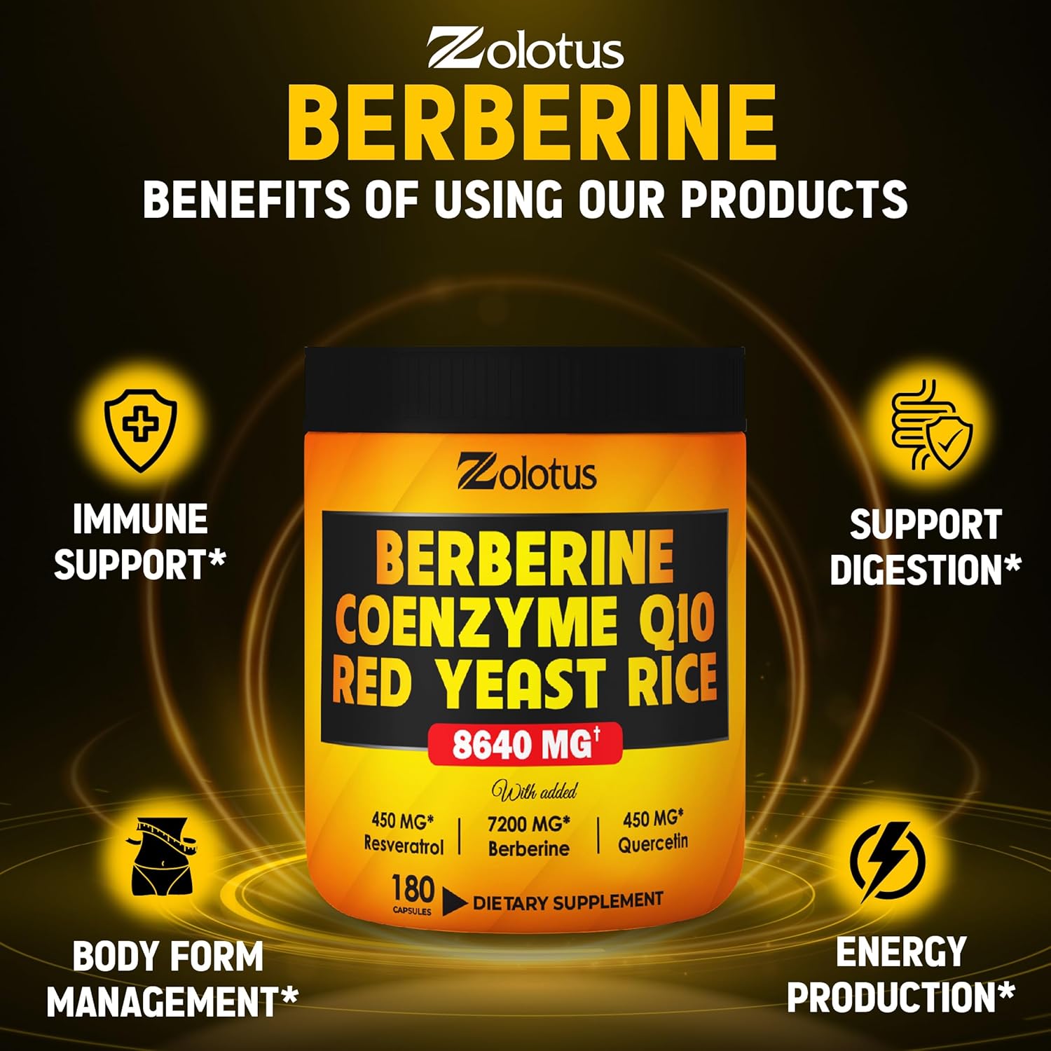 Zolotus Berberine + Red Yeast Rice Formula Provides 8640Mg Per Capsule, 3 Capsules Per Day, ThatāS Why Zolutus Berberine Is One Of The Best Berberine Supplements On Amazon.  Our Special Blend Combines The Potency Of Berberine Extract 30:1 And The Most Powerful Natural Herbs Such As Quercetin, Resveratrol, Red Yeast Rice, Coenzyme Q10, Vitamin B3, And Vitamin D3. That Is Specially Designed To Gain Overall Wellness In Both Men And Women.  All Zolotus Products Are Formulated In The Usa, Made With The Highest-Quality Ingredients, 100% Natural, Vegan, Non-Gmo, Gluten-Free, No Fillers, Preservatives, Binders, Or Harmful Chemicals.  2-Month Supply And Made In A Gmp Certified Facility.  Click āAdd To Cartā Now And Add This To Your Supplement List!