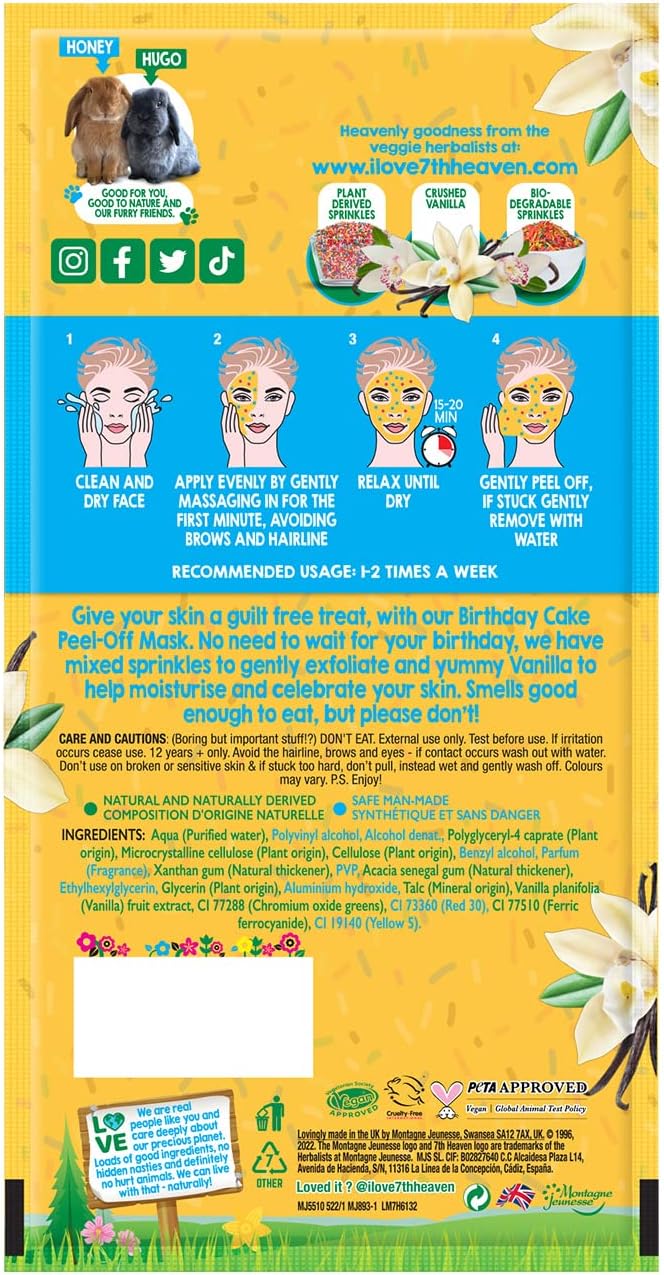 About this item YUMMY FACE MASK TO EXFOLIATE & PAMPER - No need to wait for your birthday, treat your skin to a guilt-free sweet-scented peel off mask, mixed with plant-based sprinkles that gently exfoliate your skin PACKED WITH NATURAL INGREDIENTS - 7th Heaven's Birthday Cake moisturising face masks are made with vanilla which helps to moisturise your face and leave it feeling completely refreshed SUITABLE FOR ALL SKIN TYPES - Suitable for all skin types, ensuring brighter skin for everyone. What's more, these soothing face peel masks are vegan and cruelty-free, so you can feel good about pampering yourself CONVENIENT & MESS-FREE – Simply apply a facial mask to dry, cleansed skin. Relax and leave it to dry for 15-20 minutes as it works its magic, then gently peel off to reveal a glow worth celebrating GENUINE 7TH HEAVEN SKINCARE – For over 30 years, 7th Heaven has made the world a happier place for both humans & animals. Their cruelty-free beauty products are inspired by nature’s treasures, with no hidden nasties, just pure goodness › See more product details,YUMMY FACE MASK TO EXFOLIATE & PAMPER - No need to wait for your birthday, treat your skin to a guilt-free sweet-scented peel off mask, mixed with plant-based sprinkles that gently exfoliate your skin,PACKED WITH NATURAL INGREDIENTS - 7th Heaven's Birthday Cake moisturising face masks are made with vanilla which helps to moisturise your face and leave it feeling completely refreshed,SUITABLE FOR ALL SKIN TYPES - Suitable for all skin types, ensuring brighter skin for everyone. What's more, these soothing face peel masks are vegan and cruelty-free, so you can feel good about pampering yourself,CONVENIENT & MESS-FREE – Simply apply a facial mask to dry, cleansed skin. Relax and leave it to dry for 15-20 minutes as it works its magic, then gently peel off to reveal a glow worth celebrating,GENUINE 7TH HEAVEN SKINCARE – For over 30 years, 7th Heaven has made the world a happier place for both humans & animals. Their cruelty-free beauty products are inspired by nature’s treasures, with no hidden nasties, just pure goodness
