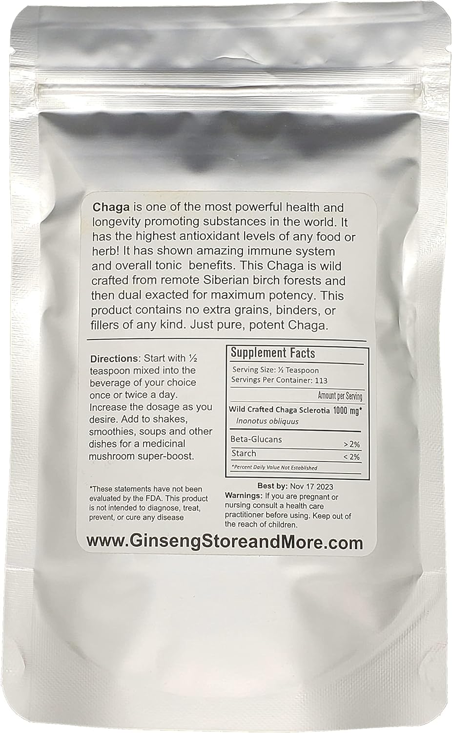 1 In Antioxidants Chaga Mushroom is one of the ultimate health promoting substances. It has been revered for millennia for its ability to support the immune system, improve energy levels, and provide an array of powerful antixoidants. Modern science has confirmed Chaga as an amazing tool for the cultivation and preservation of robust health and vitality. Being one of the most studied herbs in the world, Chaga has shown a large array of benefit, but is most known for it's incredibly high levels of antioxidants. By some research, it even has shown to have the highest naturally occurring levels of antioxidants out of any known substance! It also is incredibly high in the "master antioxidant" known as super oxide dismutase! Why Most Chaga Products Are A Waste Of Money Unfortunately most of the Chaga products available on the market today are of very little value. Many are simply ground up Chaga powder. These products are useless as Chaga is indigestible in its raw form! Other products are made using the mycellium. This is the part of the organism which usually grows underground or in wood. It is NOT the part of the mushroom that has been traditionally consumed. Furthermore, it's grown on grain, which then makes up a larger percentage of the final Chaga product. Why our Chaga Is Ideal Our Chaga extract comes from whole Chaga mushroom sclerotium, which was growing on wild Siberian Birch trees. This is widely considered the absolute best and most potent type of Chaga. The Chaga sclerotium are then DUAL EXTRACTED and standardized to >2% beta-glucans (the active constituent in Chaga) This creates a fully bio-available, highly potent Chaga product that is easily dissolved into water, shakes and smoothies. This is truly the ideal Chaga product!