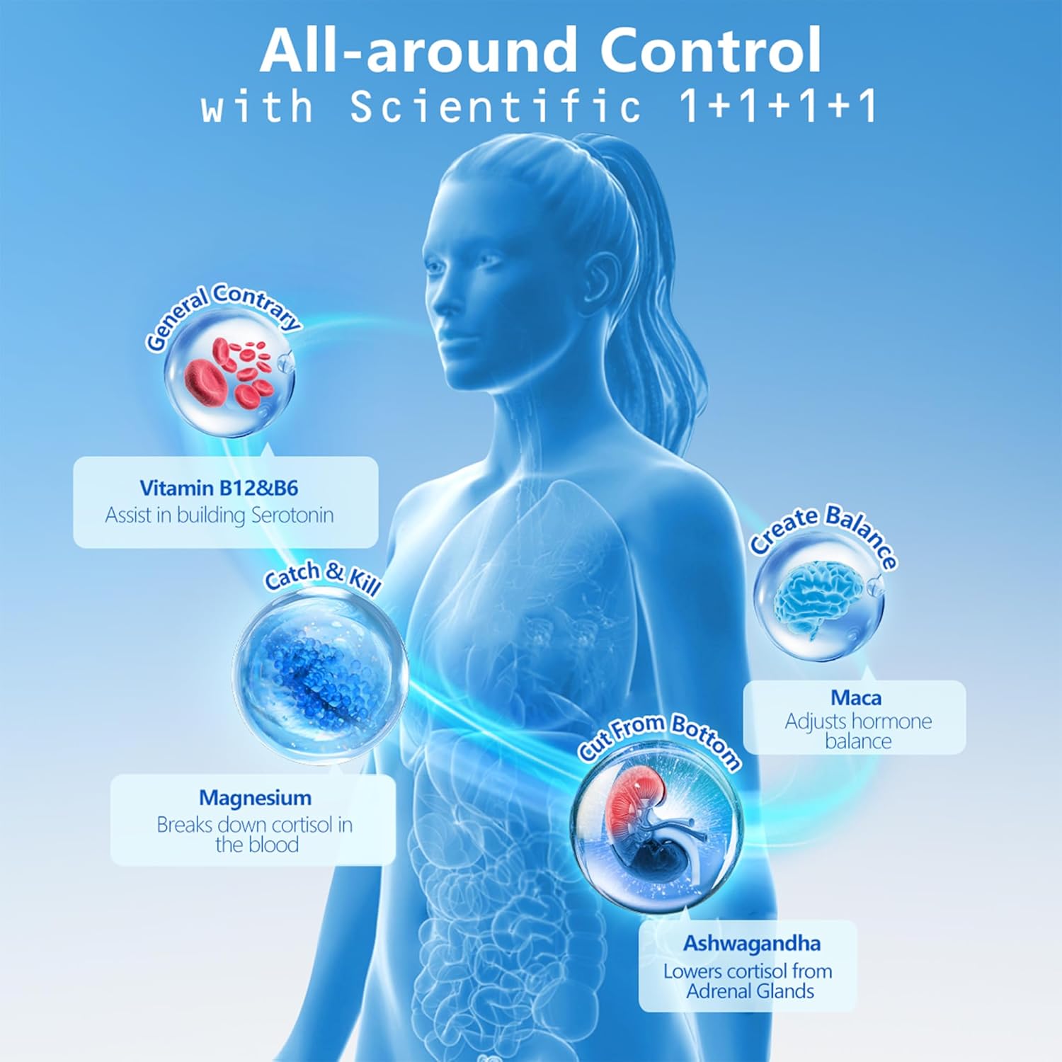 About this item CALM, RELAX & PEACEFUL NIGHT: Suffering stress Our scientific formulated 8-in-1 cortisol manager is designed to support healthy cortisol levels, promote a refreshed mind, and a restful sleep NATURAL HERBAL INGREDIENTS: Our cortisol supplement for men and women is free of artificial additives, supports better nutrient absorption, and is gentle enough for long-term use. Rich in natural antioxidants, meeting your needs for natural wellness formula MIND & ENERGY SUPPORT: Ashwagandha aids in maintaining healthy cortisol levels, supports mental well-being and focus. Maca root and Zinc contribute to overall wellness, while black pepper extract enhances nutrient absorption NERVE & MUSCLE SUPPORT: Magnesium-glycinate, combined with vitamin b complex (B6 B12 vitamins, folate), magnesium b12 helps maintain a relaxed state, sustained energy, and optimal muscle function. This ashwagandha with b12 b6 also helps maintain healthy bones for daily mobility USA CRAFTED & PREMIUM: Our magnesium ashwagandha supplements are made in the USA, manufactured following GMP standards in a facility registered with the FDA, verified for potency and purity by NSF, and third-party tested See more product details,CALM, RELAX & PEACEFUL NIGHT: Suffering stress Our scientific formulated 8-in-1 cortisol manager is designed to support healthy cortisol levels, promote a refreshed mind, and a restful sleep,NATURAL HERBAL INGREDIENTS: Our cortisol supplement for men and women is free of artificial additives, supports better nutrient absorption, and is gentle enough for long-term use. Rich in natural antioxidants, meeting your needs for natural wellness formula,MIND & ENERGY SUPPORT: Ashwagandha aids in maintaining healthy cortisol levels, supports mental well-being and focus. Maca root and Zinc contribute to overall wellness, while black pepper extract enhances nutrient absorption,NERVE & MUSCLE SUPPORT: Magnesium-glycinate, combined with vitamin b complex (B6 B12 vitamins, folate), magnesium b12 helps maintain a relaxed state, sustained energy, and optimal muscle function. This ashwagandha with b12 b6 also helps maintain healthy bones for daily mobility,USA CRAFTED & PREMIUM: Our magnesium ashwagandha supplements are made in the USA, manufactured following GMP standards in a facility registered with the FDA, verified for potency and purity by NSF, and third-party tested
