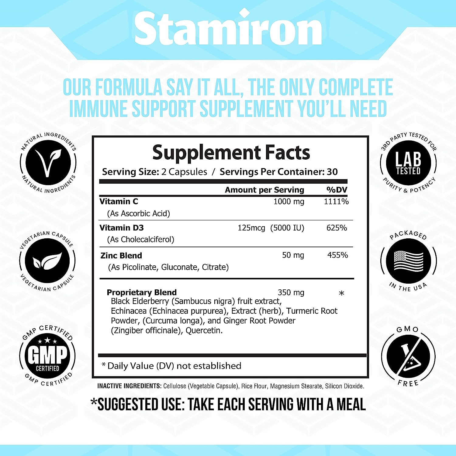 The Best All-In-1 Immune Support Supplement On The Market - You no longer need to take 8 separate products to boost your immune system. Now with just 2 capsules per day, you can get all 8 of most powerful immune health ingredients needed to stay healthy. Our formula is stacked with 3 types of Zinc (Picolinate, Gluconate, Citrate) as well as 5000IU Vitamin D3, 1000mg Vitamin C, Quercetin, Elderberry, Echinacea, Turmeric & Ginger. Stamiron are the only complete Immunity Vitamins you'll need