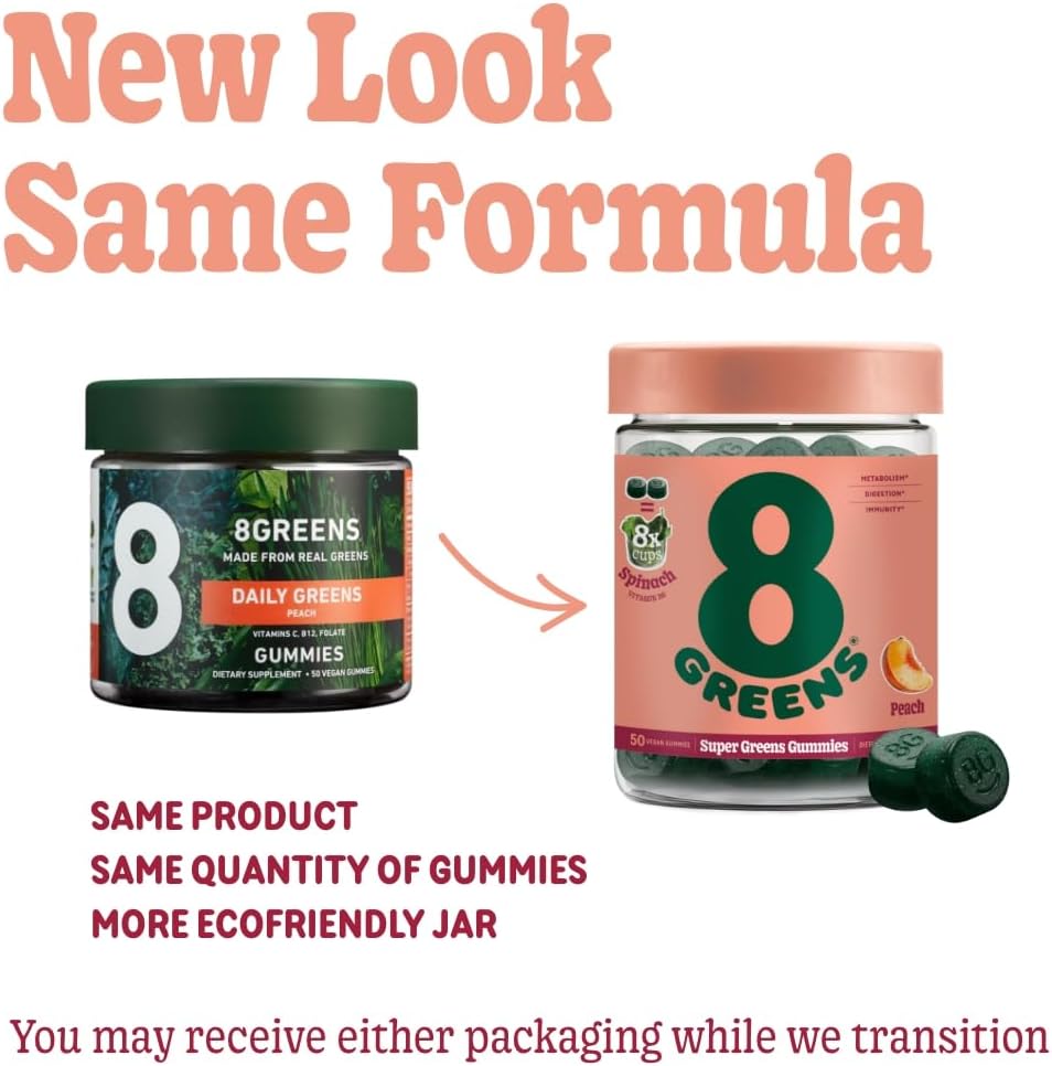 8Greens Daily Greens Gummies - Superfood Booster, Energy & Immune Support, Made With Real Greens, High In Antioxidants, Greens Powder, Vitamin C, B12, Spirulina, Peach Flavored, 50 Vegan Gummies