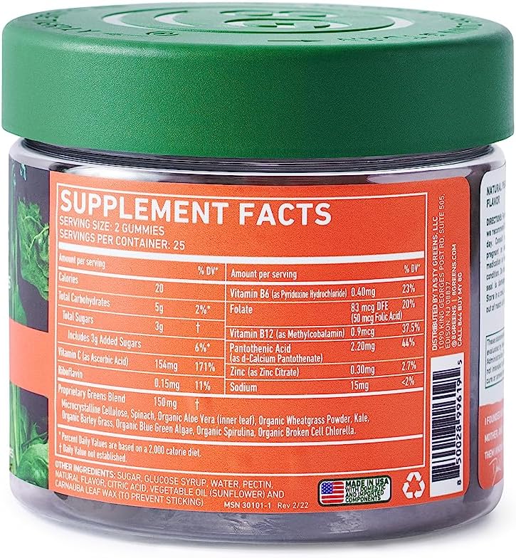 8 DAILY GREENS: Delicious peach gummies made from 8 Super Greens: Spinach, Wheatgrass, Kale, Blue Green Algae, Spirulina, Aloe Vera, Chlorella & Barley Grass. Chew 2-4 gummies a day