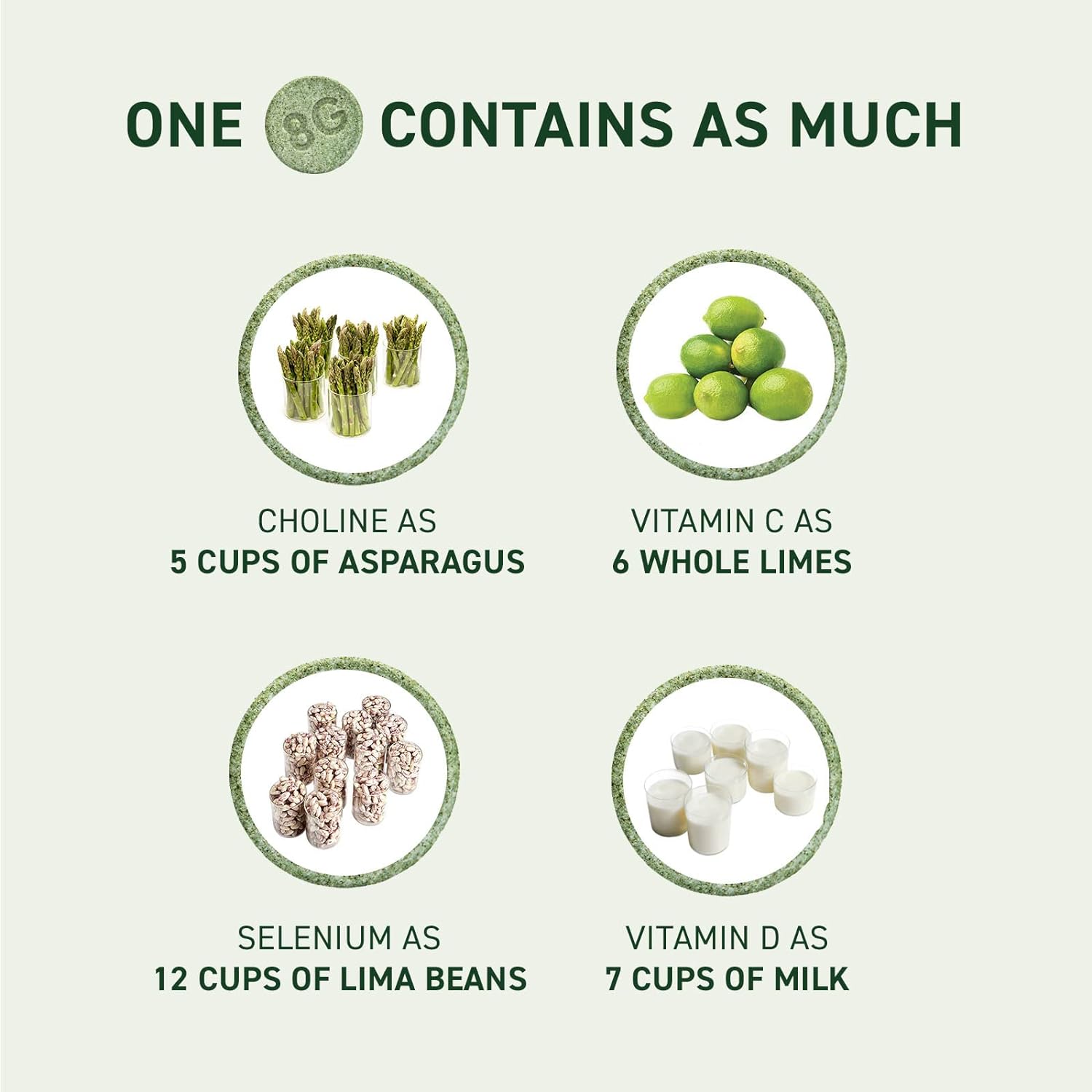 2 >WORLD'S FIRST: The World's First real greens tablets; each tablet contains as much Vitamin C as 6 whole Limes, Vitamin D as 7 cups of Milk, Choline as 5 cups of Asparagus & Selenium as 12 cups of Lima Beans