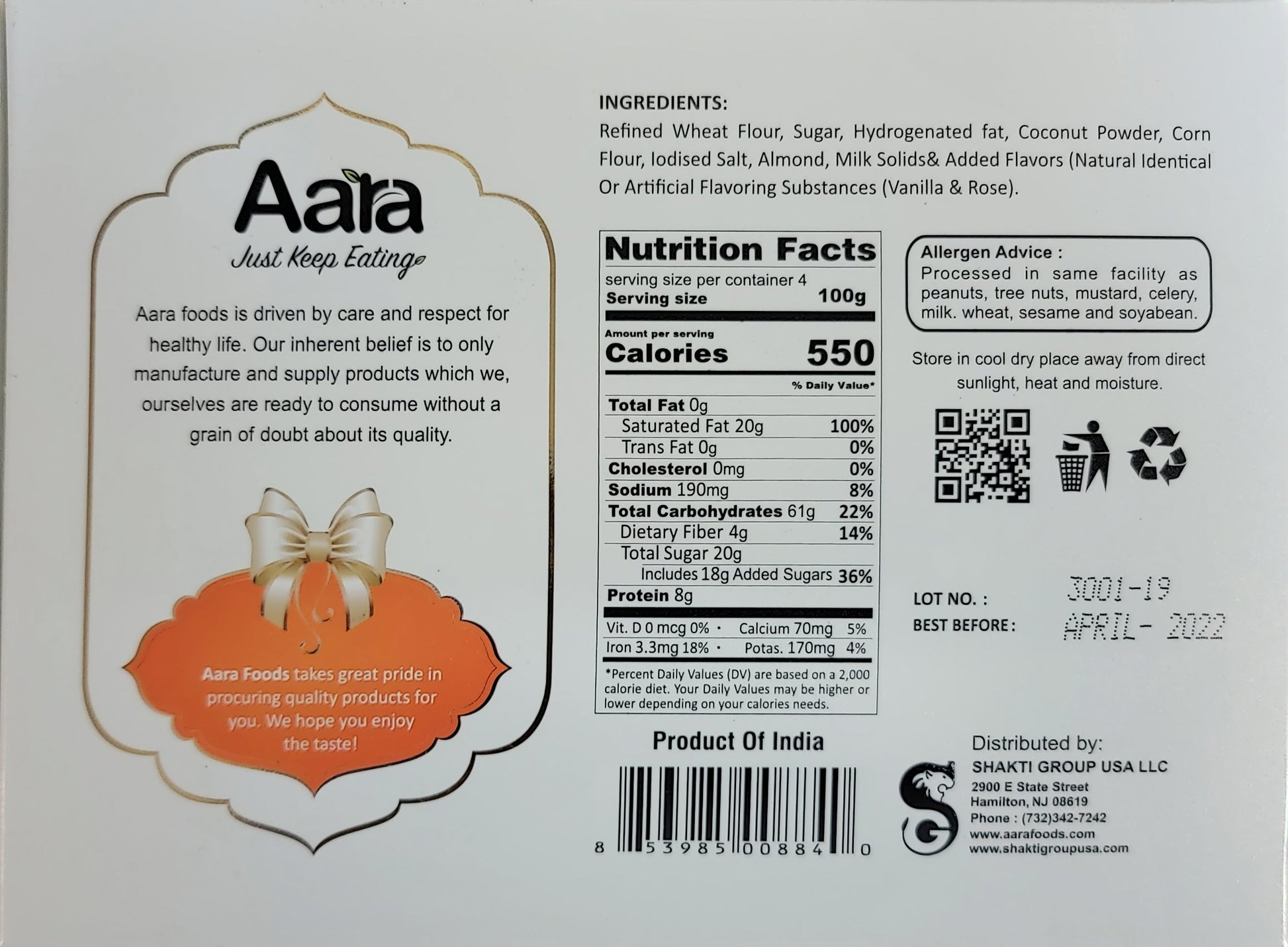 PRODUCTS DESCRIPTION: A cookie is a baked or cooked food that is typically small, flat and sweet. It usually contains flour, sugar, egg, and some type of oil, fat, or butter.The traditional recipes include a small amount of bitter almonds, which gives this cookie its name. FEATURES : Aara baked cookies Almond coconut cookies Weight: 400 gm It is made up of Refined wheat flour, coconut powder, cornflour, almond, and milk solids. Aara Almond Coconut Baked Cookies - 400gm