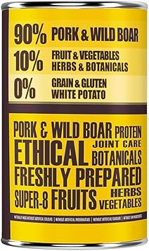 90% PORK AND WILD BOAR, HIGH-PROTEIN DOG FOOD- Our Pork and Wild Boar wet food for dogs combines 90% fresh wild boar and pork with 10% 'super-8' fruit and veg for a delicious meal your pup will enjoy