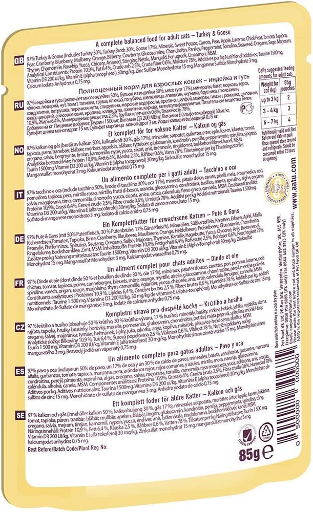 Aatu 97/3 Wet Cat Food - Turkey & Goose (10X85G) - Grain Free Recipe With No Artificial Ingredients - Easy Tear Pouches