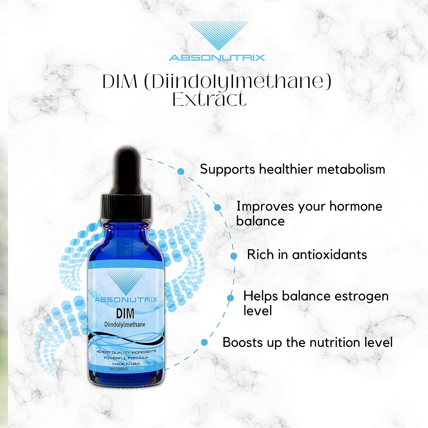 Absonutrix Dim (Diindolylmethane) Extract 593 Mg, 4 Oz Bottle, 200 Potent Servings, Third-Party Tested Drops, Quick Absorption, Gluten-Free, Third-Party Tested, Gmp-Certified, Non-Gmo, Made In Usa