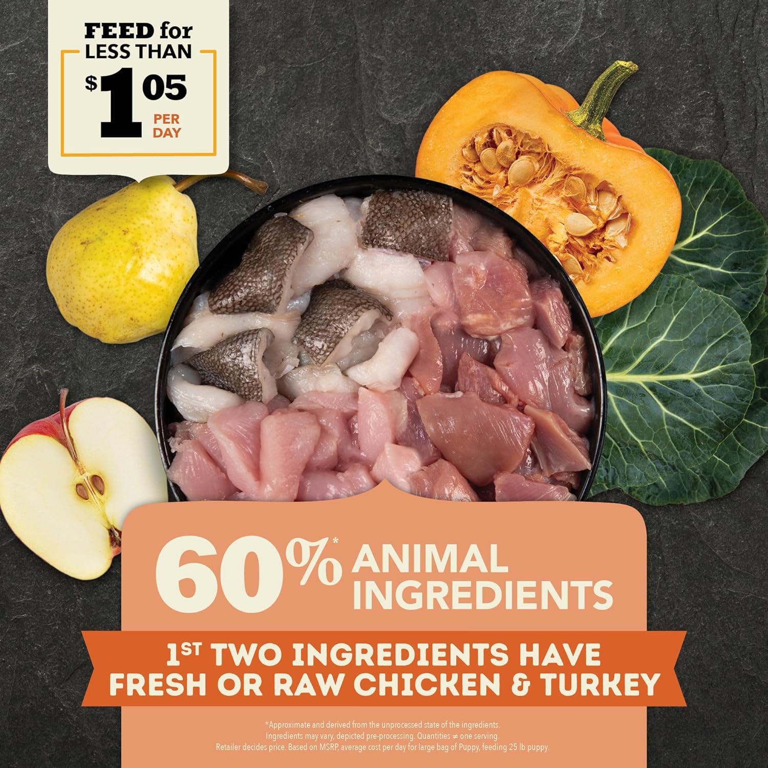 Bring Home The Quality Nutrition Your Puppy Needs To Thrive With Acana Grain Free* Puppy Recipe Dry Dog Food. This High Protein Dog Food Is Made For Puppies With Protein And Fat From Quality Animal Protein To Support Their Development. Free-Run Chicken And Free-Run Turkey And Eggs Are Balanced With Whole Pumpkin, Collard Greens, Apples And Pears To Create A Protein-Rich, Nutritious Puppy Dog Food. This Acana Dog Food For Puppies Is 65%** Quality Animal Ingredients And 35%*** Wholesome Fruits And Vegetables. Even Better, This Grain Free* Dog Food Has A Freeze Dried Coating For A Delicious Taste Your Puppy Will Crave. Choose Acana Dry Dog Food Kibble To Give Your Companion The Nutritional Foundation They Need To Live A Happy, Healthy Life. *Produced In A Facility That Also Processes Grains **Approximate And Derived From The Unprocessed State Of The Ingredients ***We Also Add Vitamins, Minerals, Natural Preservatives, Flavors And Probiotics