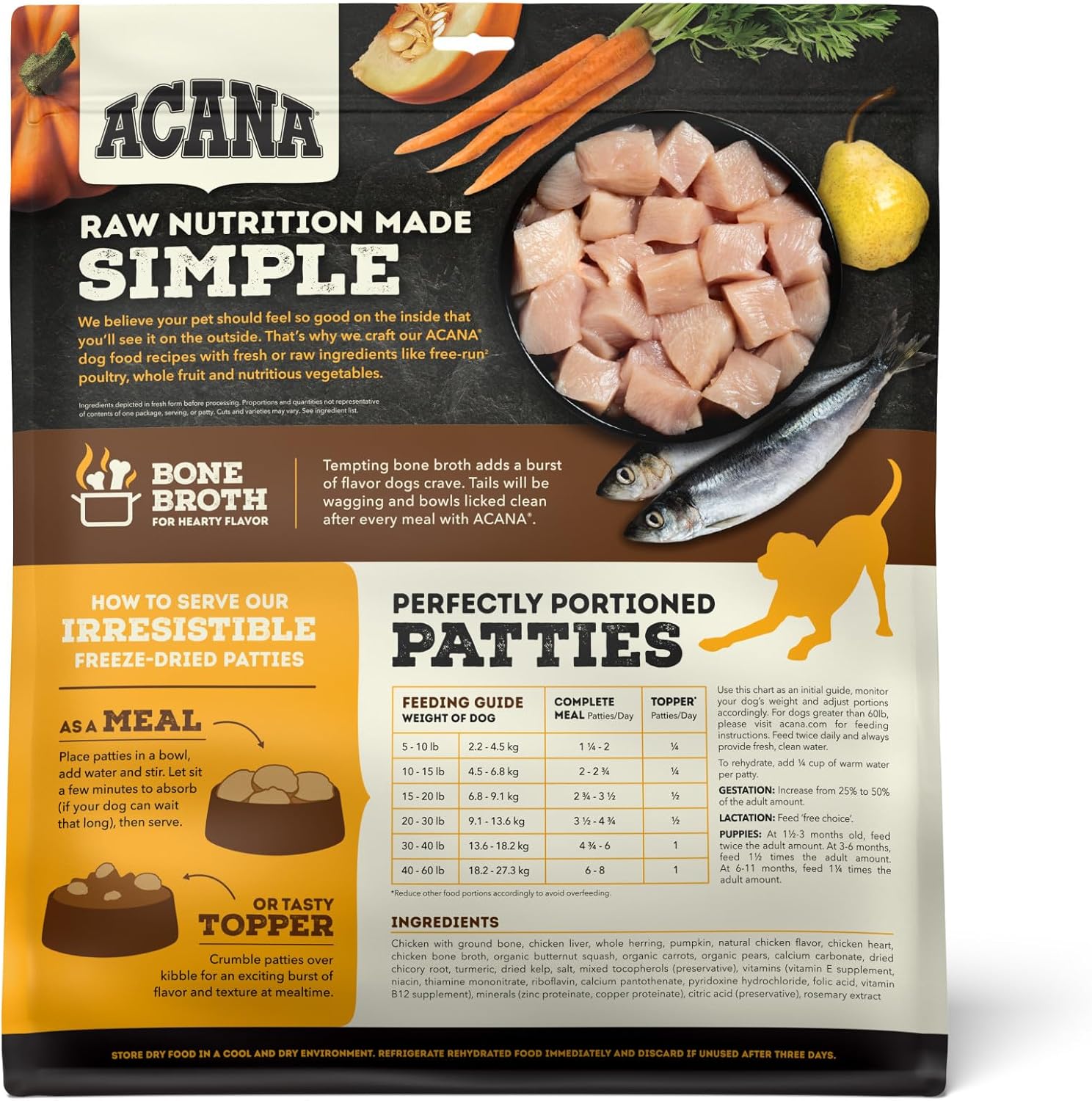 Enhance Your Dog'S Meals And Provide Protein-Rich Nutrition With Acana Free-Run Chicken** Recipe Freeze Dried Dog Food Meal And Topper. These Bite-Sized Breakable Patties Are Carefully Crafted With Superfood Ingredients Like Free-Run Chicken** And Whole Wild-Caught Herring, Balanced With Vegetables And Fruit For A Grain Free* Dog Food Packed With The Nutrients Your Dog Needs To Thrive. This Easy To Prepare Meal Tastes Great Mixed With Warm Water As A Meal, Or Crumbled On Top Of Your Dog’S Favorite Acana Kibble Or Wet Food As A Flavorful Dog Food Topper. Infused With Bone Broth, This Dog Food Offers A Burst Of Delicious Flavor Dogs Crave. This Dog Food Is Carefully Crafted With 90 Percent*** Quality Animal Ingredients. Choose Acana Freeze Dried Dog Food To Give Your Companion The Nutritional Foundation They Need To Live A Happy, Healthy Life. *Produced In A Facility That Also Processes Grains **Our Free-Run Chickens And Turkeys Are Not Housed In Cages And Are Able To Move In A Barn Without Outdoor Access ***Approximate And Derived From The Unprocessed State Of The Ingredients