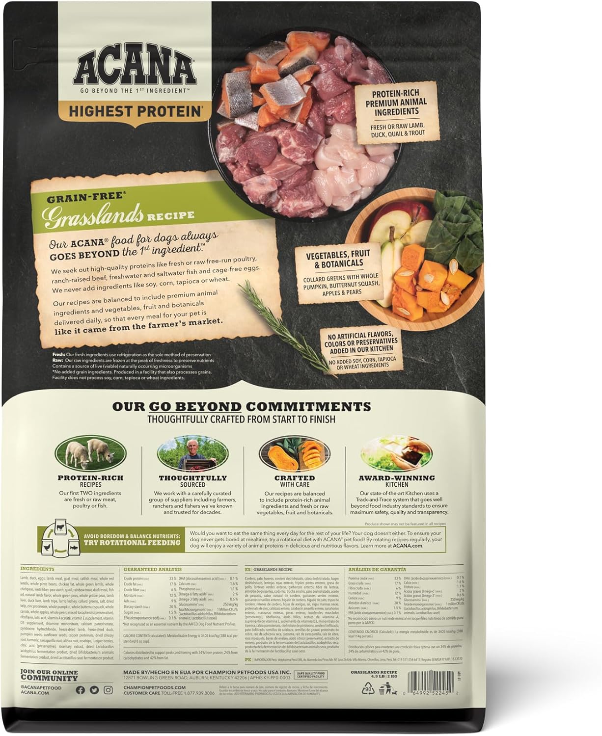 Bring Home The Quality Nutrition Your Dog Needs To Thrive With Acana Grain Free* Grasslands Recipe Dry Dog Food. With The Highest Protein Offering In Acana Pet Foods, This High Protein Dog Food Is For All Life Stages, Except For Growth Of Large Size Dogs (70 Lb Or More As An Adult) And Includes Probiotics And Fiber To Support Healthy Digestion. Protein-Rich Lamb, Duck, Eggs, Quail And Rainbow Trout Are Balanced With Whole Pumpkin, Collard Greens, Butternut Squash, Apples And Pears To Offer A Nutritious, High-Fiber Option For Your Dog. This Acana Dog Food Is 70 Percent** Quality Animal Ingredients And 30 Percent*** Vegetables, Fruit And Nutrients. Even Better, This Grain Free* Dog Food Kibble Has A Freeze Dried Dog Food Coating Made Of Lamb And Duck For A Delicious Taste Your Dog Will Crave. Choose Acana Dry Dog Food To Give Your Companion The Nutritional Foundation They Need To Live A Happy, Healthy Life. *Produced In A Facility That Also Processes Grains **Approximate And Derived From The Unprocessed State Of The Ingredients ***We Also Add Vitamins, Minerals, Natural Preservatives, Probiotics And Antioxidants