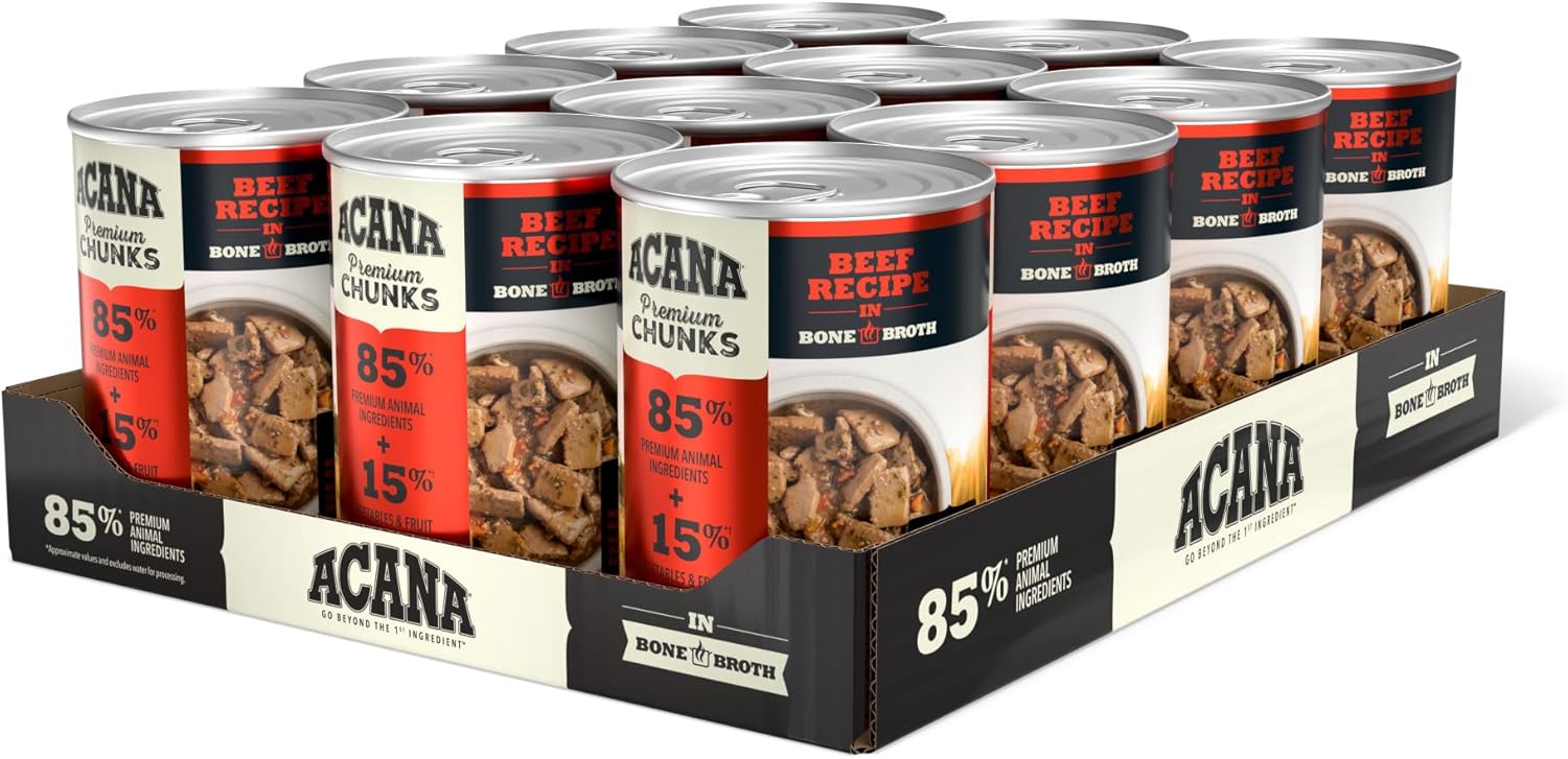 Twelve (12) 12.8 Oz Cans Of Acana Premium Chunks Beef Recipe In Bone Broth Wet Dog Food