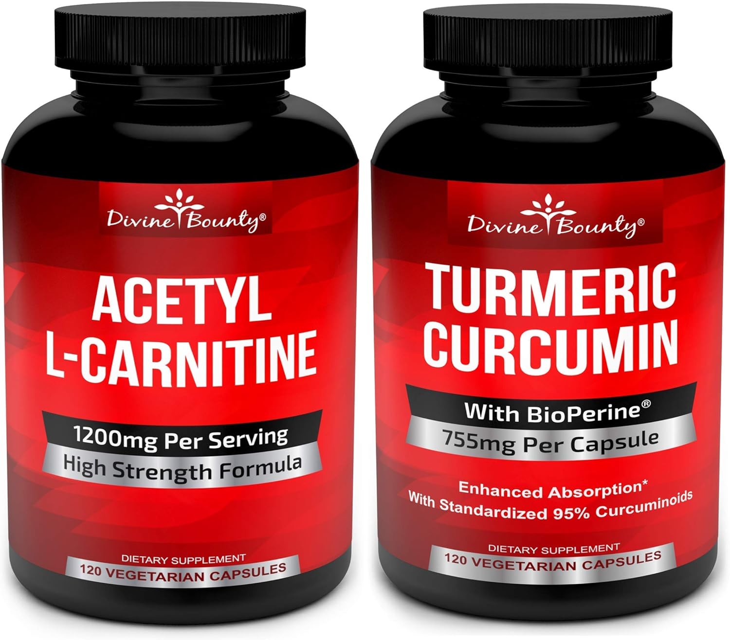 Acetyl L Carnitine - Acetyl L-Carnitine has been studied quite heavily and is commonly used by athletes. If you are looking for a superior supplement, look no further! Divine Bounty offers one of the most potent available. Our extra strength formula contains an incredible 1200mg Acetyl L Carnitine powder per serving of two capsules50% More Potent, Best Value - Our Turmeric Curcumin with BioPerine formula is the most potent on the market. A highly Potent 750mg per capsule (most other brands are only 500mg per capsule). Turmeric also contains beta-carotene, vitamin C and calciumClean, Pure & Made In USA - Many competitors include ingredients that are harmful or you do not need. Our formula is Gluten free and has no GMO's, binders, fillers, preservatives, artificial ingredients or stearates. There is also no soy, milk, egg, shellfish, wheat, peanuts or any other ingredients that shouldn't be in there. Best of all, it's made in an inspected facility following strict GMP guidelines to ensure purity and potencyA Supplement You Can Take With Confidence - Divine Bounty is proudly made in the USA in an inspected facility. We stand behind our supplements and are proud to have the best formula on the market. If it doesn't work for you, let us know. We care about your resultsAcetyl L-Carnitine & Turmeric Curcumin with BioPerine Bundle
