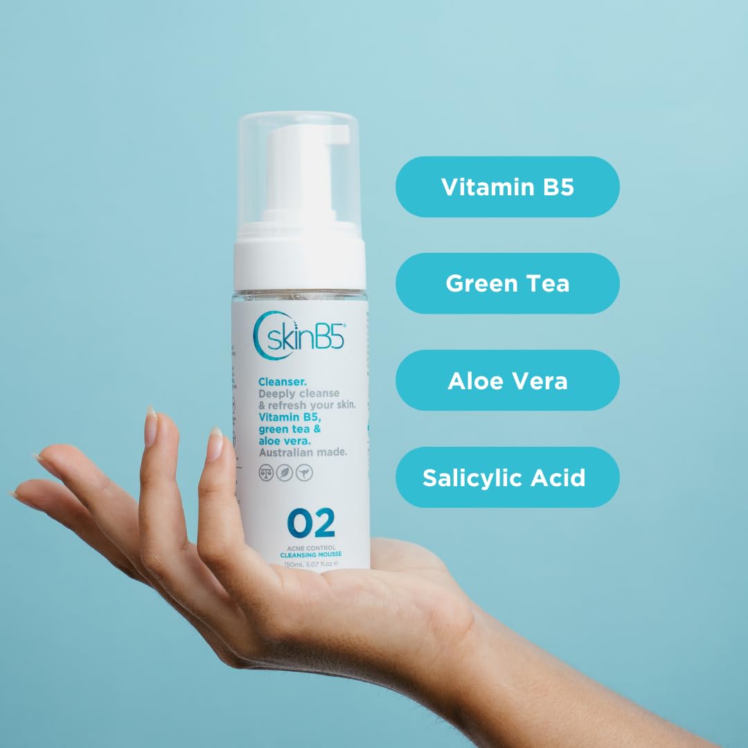 About this item EFFECTIVE ACNE TREATMENT: Experience the power of our gentle skin cleanser, specially formulated for acne-prone skin. Clear, healthy skin is just a pump away. ADVANCED SCIENCE, NATURAL CARE: This acne treatment combines <0.5% Salicylic Acid with Vitamin B5, Green Tea, and Aloe Vera. Deeply cleanse, soothe, and prevent breakouts. YOUR DAILY CLEANSING RITUAL: Begin your morning and evening routine with confidence. Apply 1 pump on wet palms, massage, and rinse for refreshed, clear skin. MULTIPURPOSE WONDER: Not just a face wash - use our mousse to remove makeup or enjoy as a gentle shaving foam. Discover the versatility of SkinB5's revolutionary skincare range. GENTLE CLEANSING FOR CLEAR SKIN: Our facial cleanser is made with an antioxidant-rich formula that gently cleanses, soothes, and repairs, leaving your skin refreshed. Ideal for everyday use and any skin type. See more product details,EFFECTIVE ACNE TREATMENT: Experience the power of our gentle skin cleanser, specially formulated for acne-prone skin. Clear, healthy skin is just a pump away,ADVANCED SCIENCE, NATURAL CARE: This acne treatment combines <0.5% Salicylic Acid with Vitamin B5, Green Tea, and Aloe Vera. Deeply cleanse, soothe, and prevent breakouts,YOUR DAILY CLEANSING RITUAL: Begin your morning and evening routine with confidence. Apply 1 pump on wet palms, massage, and rinse for refreshed, clear skin,MULTIPURPOSE WONDER: Not just a face wash - use our mousse to remove makeup or enjoy as a gentle shaving foam. Discover the versatility of SkinB5's revolutionary skincare range,GENTLE CLEANSING FOR CLEAR SKIN: Our facial cleanser is made with an antioxidant-rich formula that gently cleanses, soothes, and repairs, leaving your skin refreshed. Ideal for everyday use and any skin type