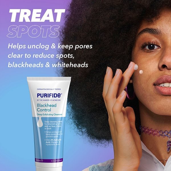 Purifide is the NEW range of clear skin daily skincare from the makers of Acnecide. Deep cleansing, BHA exfoliant wash for blemish-prone skin on face, chest or back. With 2% salicylic acid, a Beta Hydroxy Acid (BHA) known to exfoliate and help deeply clean oily pores. Helps prevent blackheads and spots. Easy rinsing, non-foaming gel formuation with gentle exfoliating particles. Delivers refreshed, smoother, radiant skin