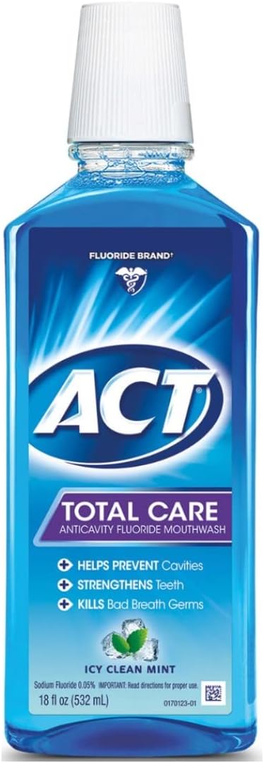 ACT Total Care Anticavity Fluoride Mouthwash in Icy Clean Mint flavor is a highly effective oral care product designed to promote good oral hygiene and help prevent tooth decay. This refreshing mouthwash provides a powerful defense against cavities and leaves your mouth feeling clean and invigorated. NDC Code: 41167-0965-0