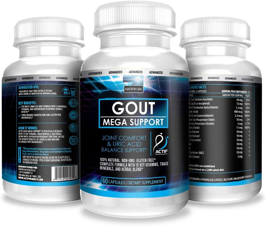 Actif Gout Mega Support With 15 Advanced Factors - Balances Uric Acid Levels - Non-Gmo, Fast-Acting, Made In Usa, 60 Count