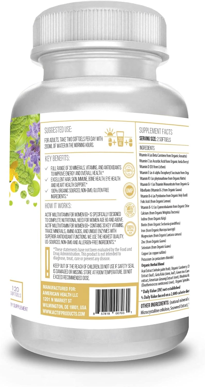 Actif Multivitamin For Women Age 60+ With 30 Organic Vitamins And Organic Herbs, Non-Gmo, Made In Usa, 2-Month Supply