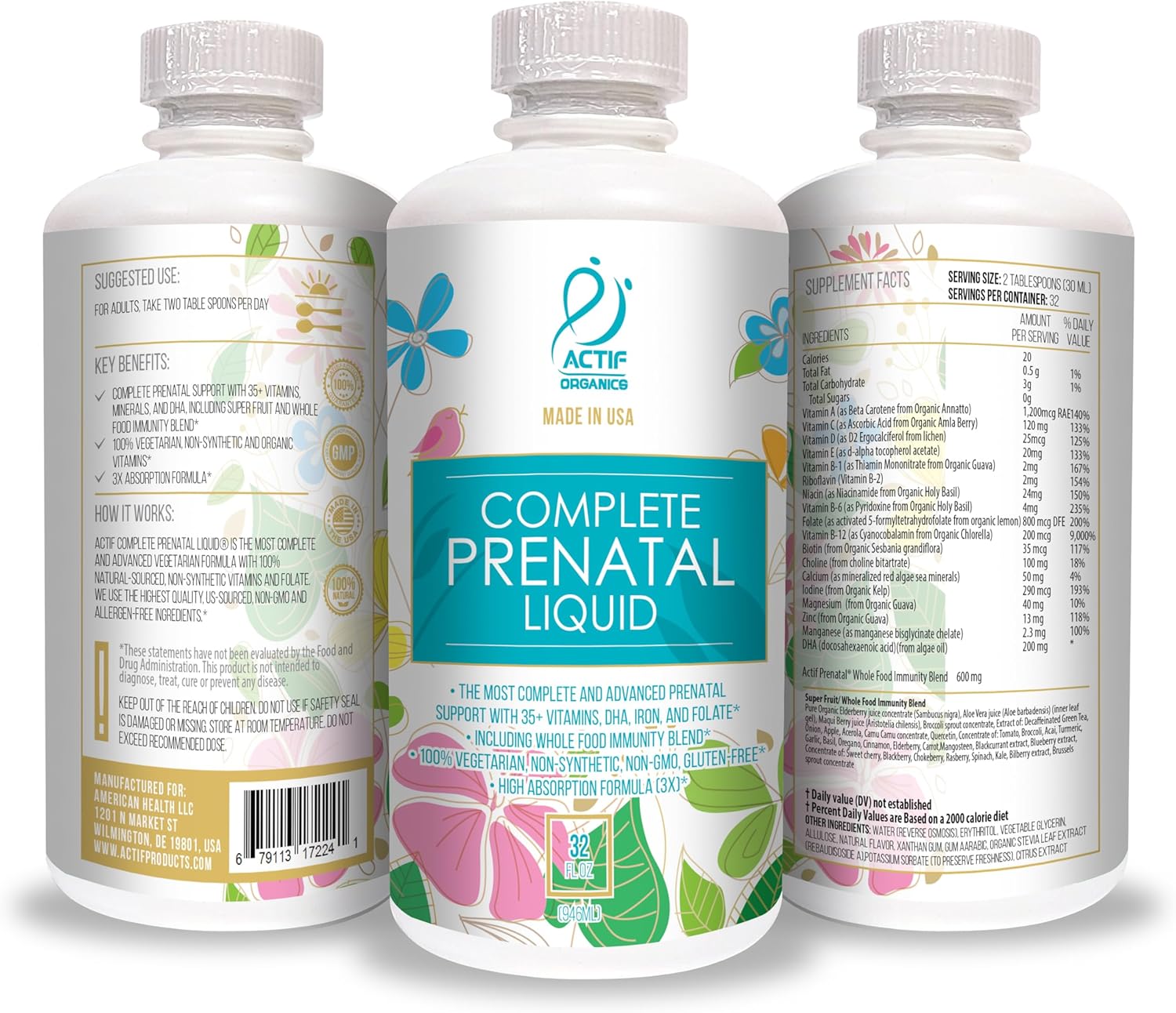 Actif Organic Complete Prenatal Liquid With 45+ Vitamins And Organic Herbs, With Dha And Choline, Non-Gmo, Made In Usa, 32Oz