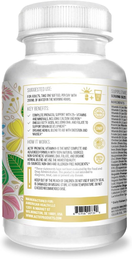 Actif Organic Prenatal Vitamin With 30+ Organic Vitamins, 100% Natural, Dha, Epa, Omega 3, And Organic Herbal Blend - Non-Gmo, 90 Count, 2024 Formula