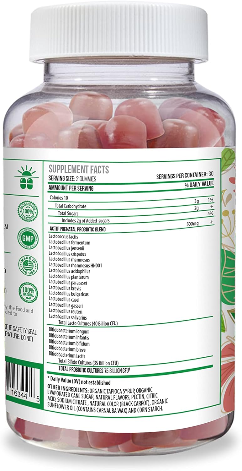 Actif Prenatal Probiotic Maximum Strength With 75 Billion Cfu And 20 Strains, Immunity And Gut Support, Zero Nausea Formula - Made In The Usa, 60 Gummies, Strawberry Flavor