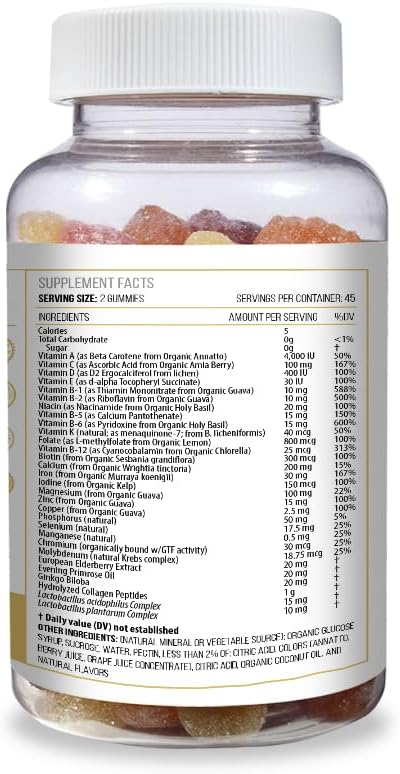 The most complete and advanced organic gummy multivitamin with 45+ vitamins, minerals, CoQ10, and organic herbal blends. All ingredients are sourced in the US. Contains macro and trace minerals that work together synergistically to support women age 60+