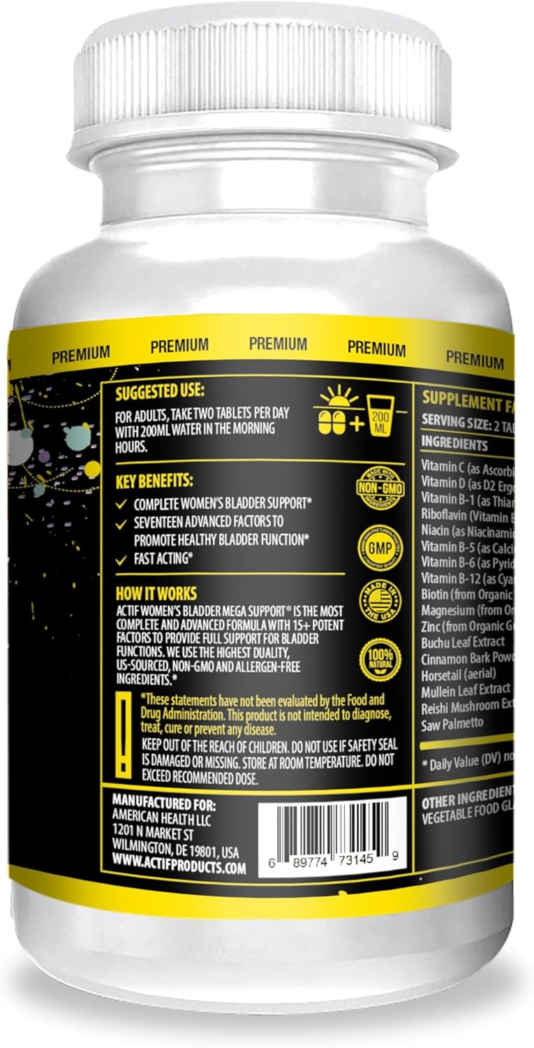 Actif Women'S Bladder Mega Support With 15+ Factors, Non-Gmo, For Bladder Control And Complete Bladder Support, Made In Usa, 120 Count