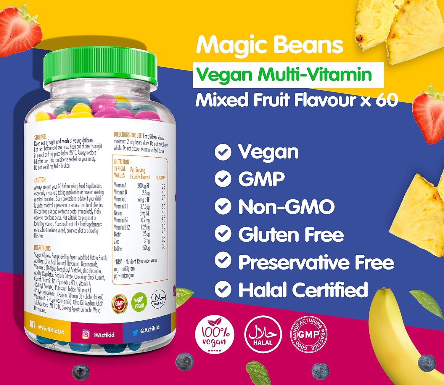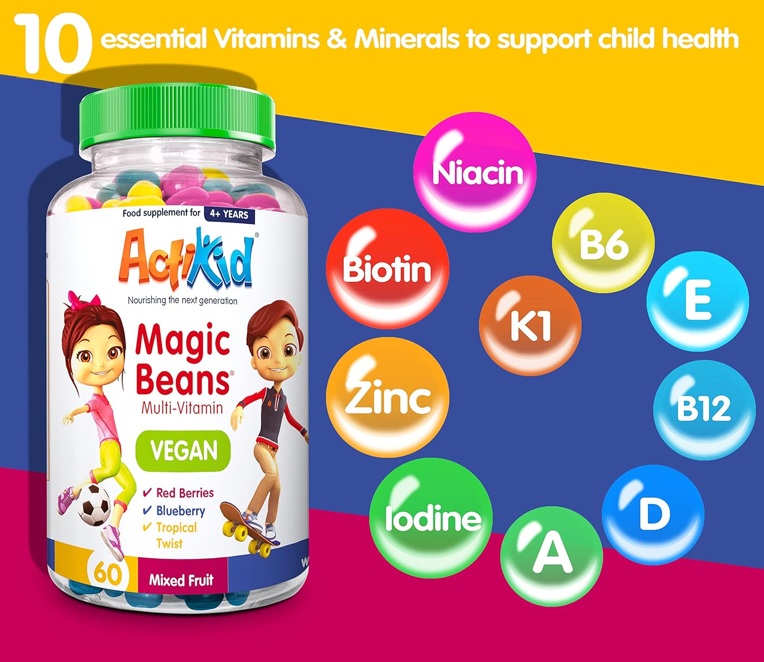 DESCRIPTION : ActiKid Magic Beans 60x Mixed Fruit Flavour | Kids Vitamins | Kids Multivitamin | Childrens Vitamins | Blueberry | Red Berries | Tropical Twist | Gelatine Free | Immunity Booster| Vegan