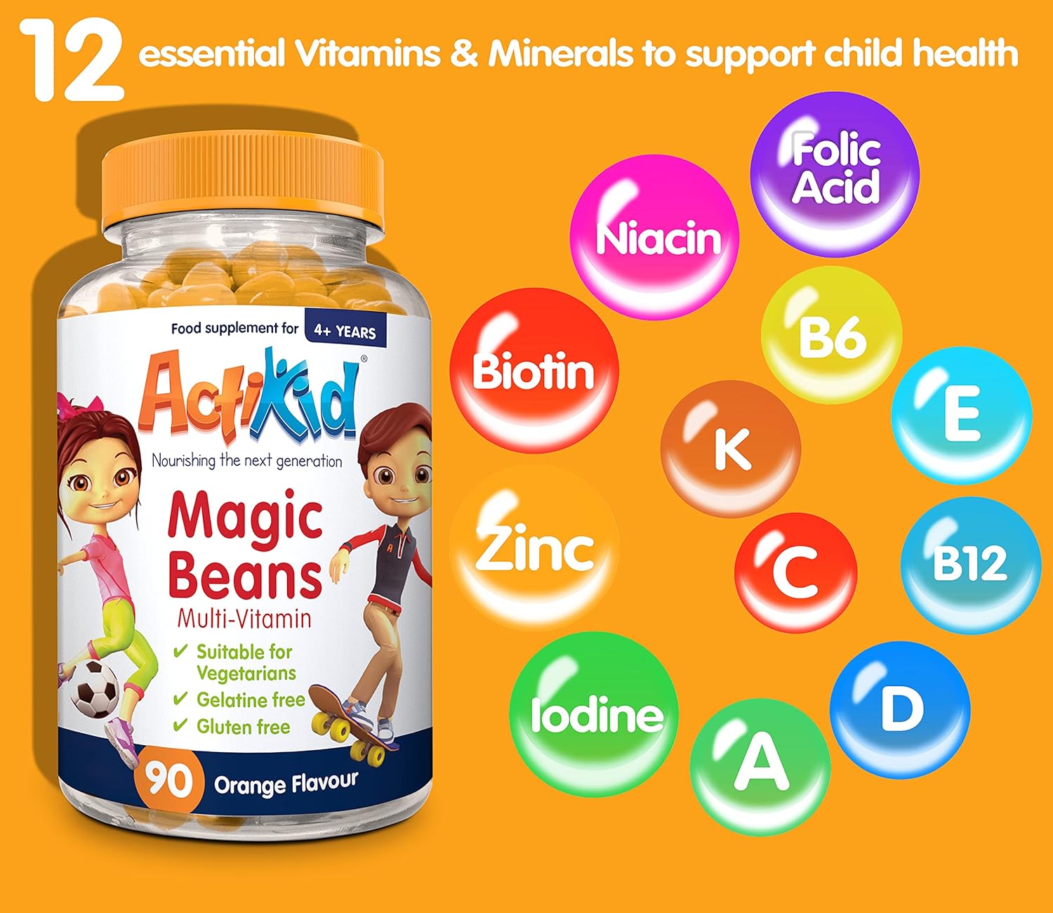DESCRIPTION : ActiKid Magic Beans Multi-Vitamin 90x Orange Flavour, Gelatine Free, Immunity Boost, Kids Vitamins, Kids Multivitamin, Childrens Vitamins