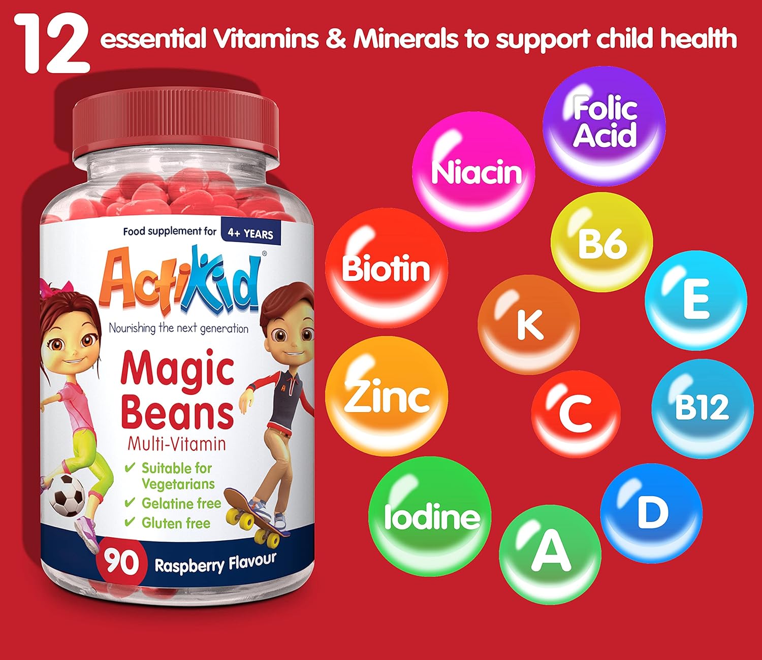 DESCRIPTION : ActiKid Magic Beans Multi-Vitamin 90x Raspberry Flavour, Gelatin Free, Immune System Booster, Kids Vitamins, Kids Multivitamin, Childrens Vitamins