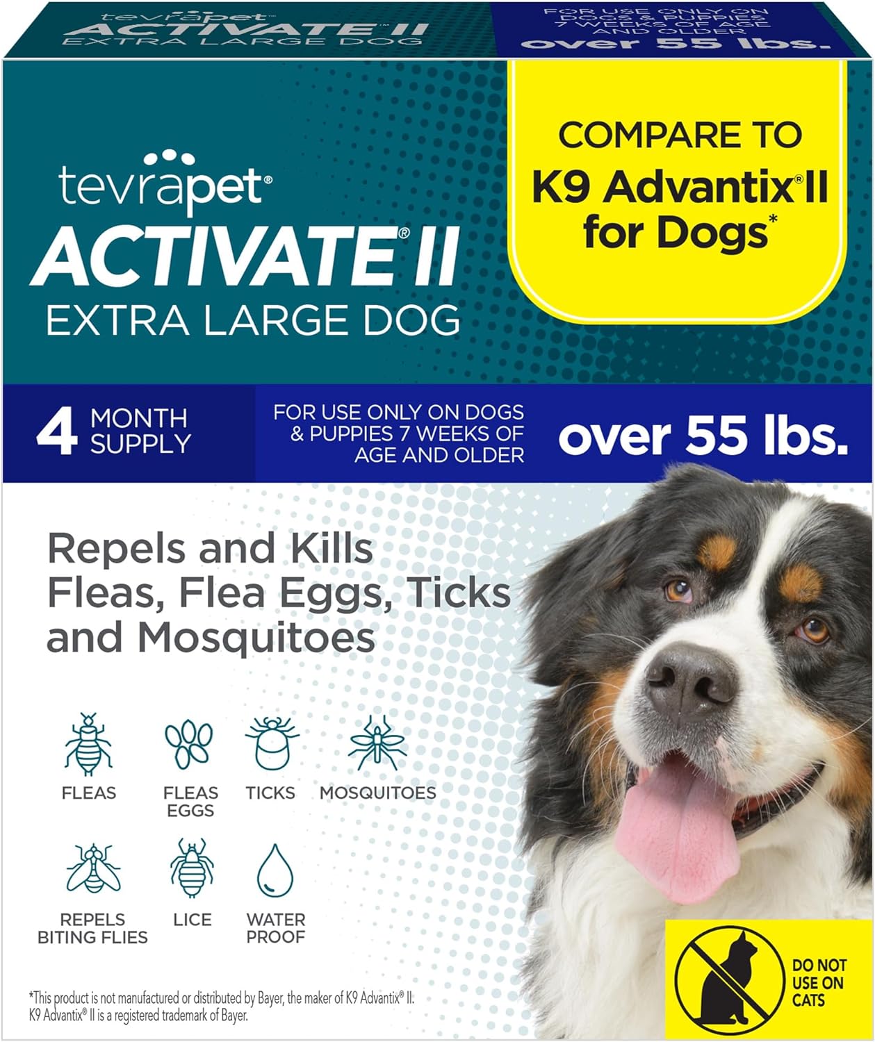 COMPARE TO K9 ADVANTIX II: Activate II uses Imidacloprid, Permethrin, and Pyriproxyfen - the same safe, fast acting active ingredients used in Advantix II for Dogs. Includes 4 monthly doses10ACTIVELY PROTECTS YOUR DOG: Activate II is approved by veterinarians to repel and kill fleas and ticks on contact - before your dog is exposed to bites and potential flea borne illnesses10STOP INFESTATIONS FAST: Our topical drops prevent infestations by breaking the flea life cycle - our insect growth regulator (IGR) starts killing flea eggs and larvae within 12 hours of application10EASY TO APPLY: Simply apply to the base of your dog's neck, and the waterproof solution will travel across the skin - providing continuous protection for 30 days per application10MADE IN AMERICA - RESULTS GUARANTEED: TevraPet Activate II is made to the quality standard we demand for our own pets. We're proud to help you protect your dog with confidence