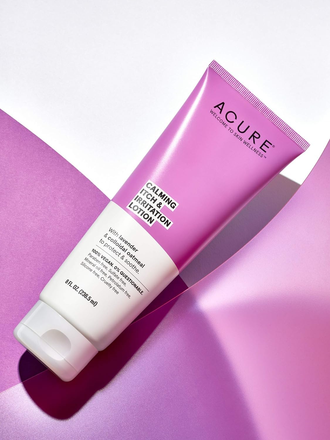 ACURE Calming Itch & Irritation Lotion - Moisturizing Lotion with Colloidal Oatmeal, Cocoa, Shea Butter Blend - Soothing Relief Cream with Lavender Aroma for Irritated Dry Skin - 100% Vegan - 8 Fl Oz,NOURISHING HYDRATION - Experience relief from dry, irritated skin with ACURE's Calming Itch & Irritation Lotion. Packed with the goodness of Colloidal Oatmeal, Cocoa, and Shea Butter, this gentle lotion ensures your skin stays moisturized, helping to soothe itching and discomfort,TOTAL SKIN PROTECTION - Don't just treat the symptoms; protect your skin from future irritation. Colloidal oatmeal, cocoa, and shea butter create a protective barrier, preventing further chafing, chapping, or cracking. Your skin deserves this shield,SOOTHING LAVENDER SCENT - Our moisturizer lotion isn't just about skincare; it's a sensory delight too! The calming lavender aroma soothes your skin and senses, providing a spa-like experience every time you apply it. Relaxation and skincare rolled into one, specially just for you!,ALL-IN-ONE GENTLE FORMULA - Embrace the all in one power of all natural plant-based extract formula with ACURE Calming Itch & Irritation Lotion. Say goodbye to dry, itchy skin and hello to a calm, radiant hydrate skin. Your skin deserves the best, and we've got you covered,CLEAN BEAUTY, CRUELTY-FREE - Feel good about what you're putting on your skin. ACURE's All Product is not only vegan and cruelty-free but also free from harmful ingredients like Parabens, Sulfates, Mineral Oil, Petrolatum, and Formaldehyde. Producing clean & safe beauty you can trust