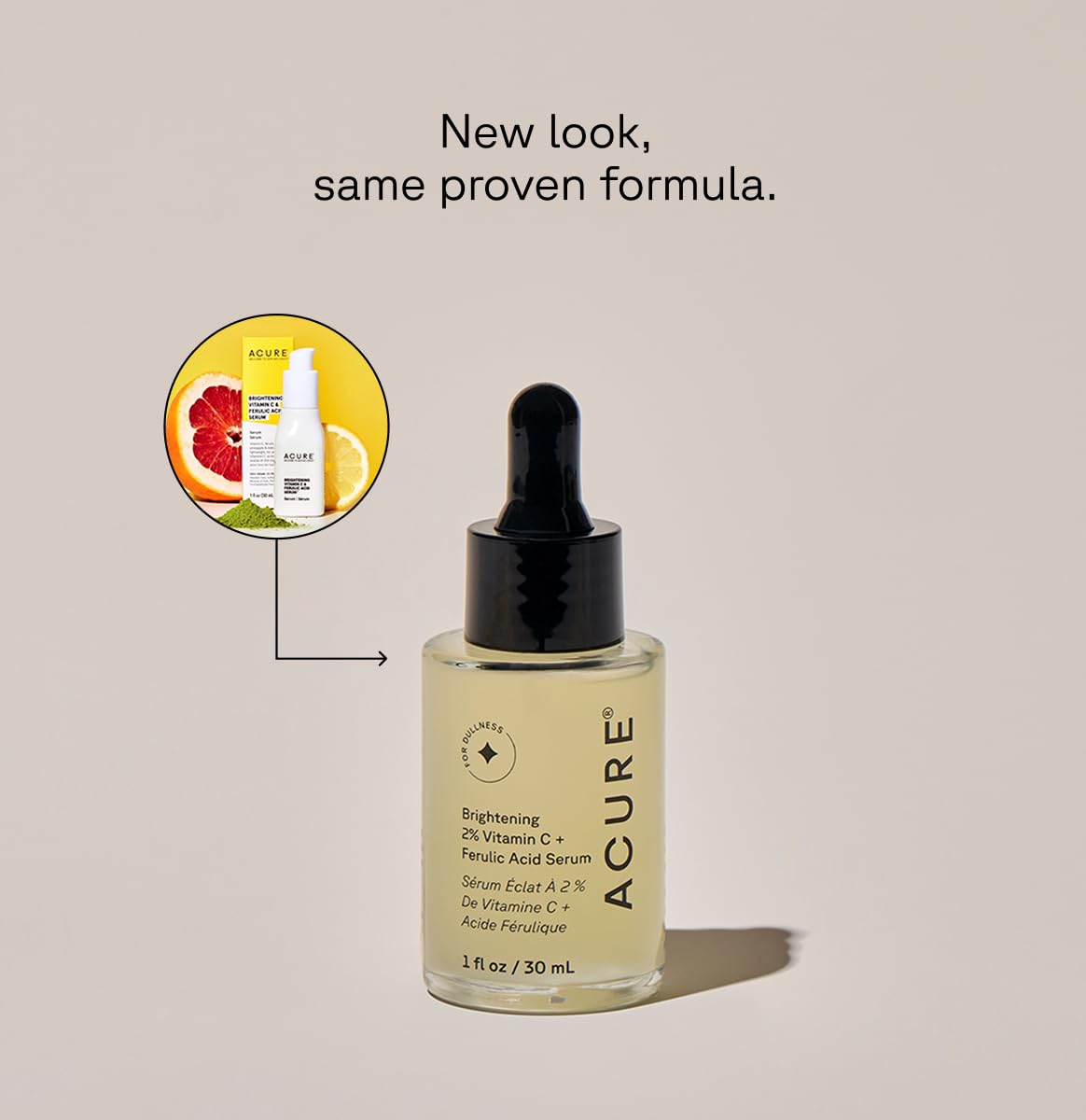 About this item BRIGHTENING SERUM - Our ACURE Brightening Vitamin C & Ferulic Acid Serum is expertly formulated face serum for all to brighten your complexion. This powerful combination helps fade dark spots, evens skin tone, and enhances your natural glowing skin. POWER OF NATURAL INGREDIENTS - Experience the revitalizing properties of Pineapple Extract. These super ingredients are packed with antioxidants that combat free radicals, support skin vitality, and leave your skin feeling refreshed and rejuvenated. FOR ALL SKIN TYPES - Whether with sensitive, oily, dry, or combination skin, our serum is designed to work well with all skin types. ACURE's Brightening Serum is your versatile solution for achieving that radiant, healthy look you've been longing for. PURE AND SAFE SKINCARE - At ACURE, we prioritize your safety. Our serum is free from harmful ingredients such as parabens and sulfates, ensuring that you're only applying the best to your skin. Enjoy peace of mind, knowing that your skincare routine is free from potentially harmful chemicals. 100% VEGAN & CRUELTY-FREE - Embrace guilt-free beauty with our 100% Vegan and Cruelty-Free All Natural Ingredient. By choosing ACURE, you support a brand committed to ethical practices. No animal testing, no animal-derived ingredients β just pure, plant-based goodness  See more product details,BRIGHTENING SERUM - Our ACURE Brightening Vitamin C & Ferulic Acid Serum is expertly formulated face serum for all to brighten your complexion. This powerful combination helps fade dark spots, evens skin tone, and enhances your natural glowing skin,POWER OF NATURAL INGREDIENTS - Experience the revitalizing properties of Pineapple Extract. These super ingredients are packed with antioxidants that combat free radicals, support skin vitality, and leave your skin feeling refreshed and rejuvenated,FOR ALL SKIN TYPES - Whether with sensitive, oily, dry, or combination skin, our serum is designed to work well with all skin types. ACURE's Brightening Serum is your versatile solution for achieving that radiant, healthy look you've been longing for,PURE AND SAFE SKINCARE - At ACURE, we prioritize your safety. Our serum is free from harmful ingredients such as parabens and sulfates, ensuring that you're only applying the best to your skin. Enjoy peace of mind, knowing that your skincare routine is free from potentially harmful chemicals,100% VEGAN & CRUELTY-FREE - Embrace guilt-free beauty with our 100% Vegan and Cruelty-Free All Natural Ingredient. By choosing ACURE, you support a brand committed to ethical practices. No animal testing, no animal-derived ingredients β just pure, plant-based goodness