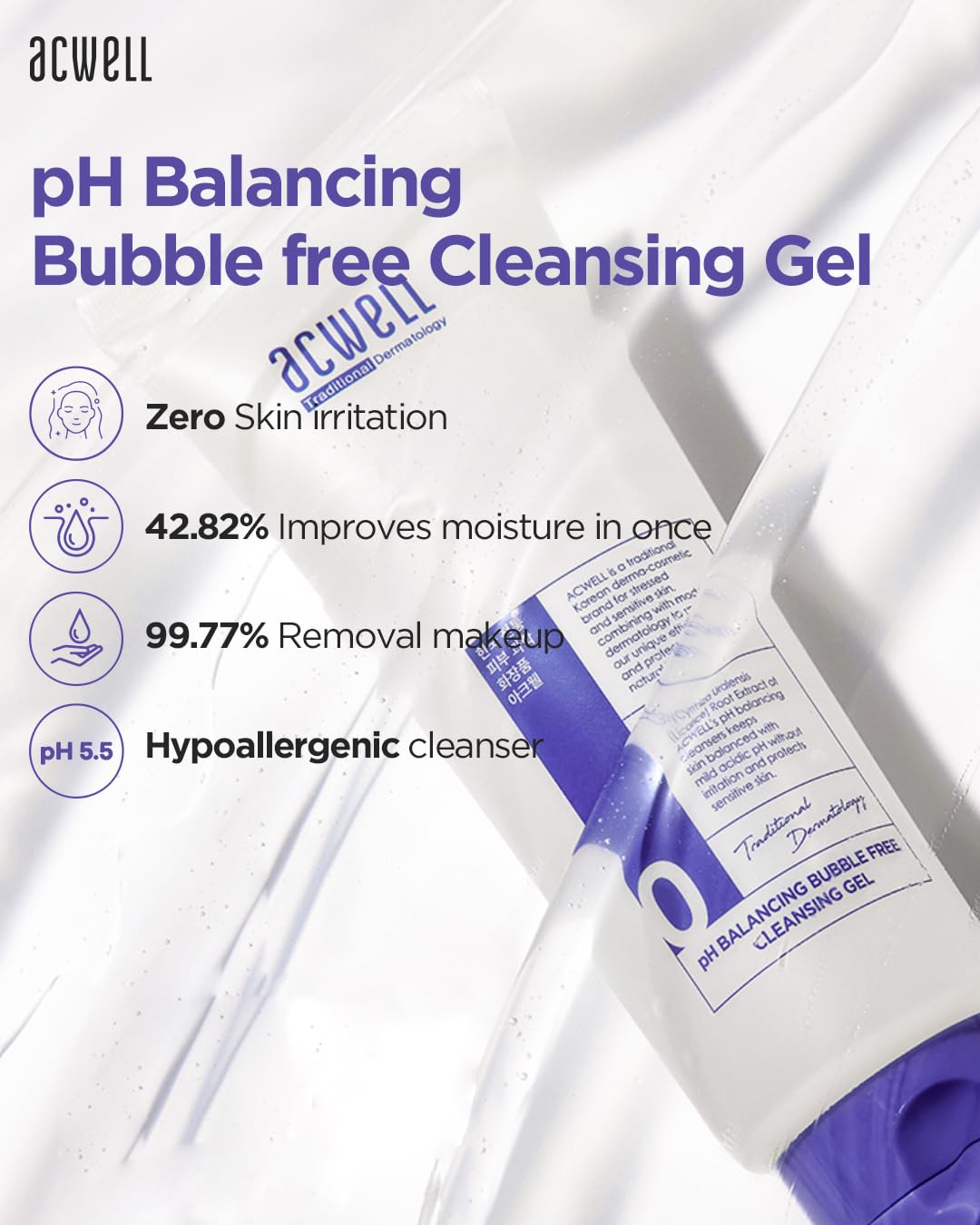 NON-FOAMING BUBBLE-FREE CLEANSING GEL: Acwell pH Balancing Bubble-Free Cleansing Gel is enriched with 8 types of Hyaluronic Acid, Elder Flower Extract and Licorice Extract. This aqua formula helps to calm irritated and sensitive skin while deep cleansing the impurities from the pores