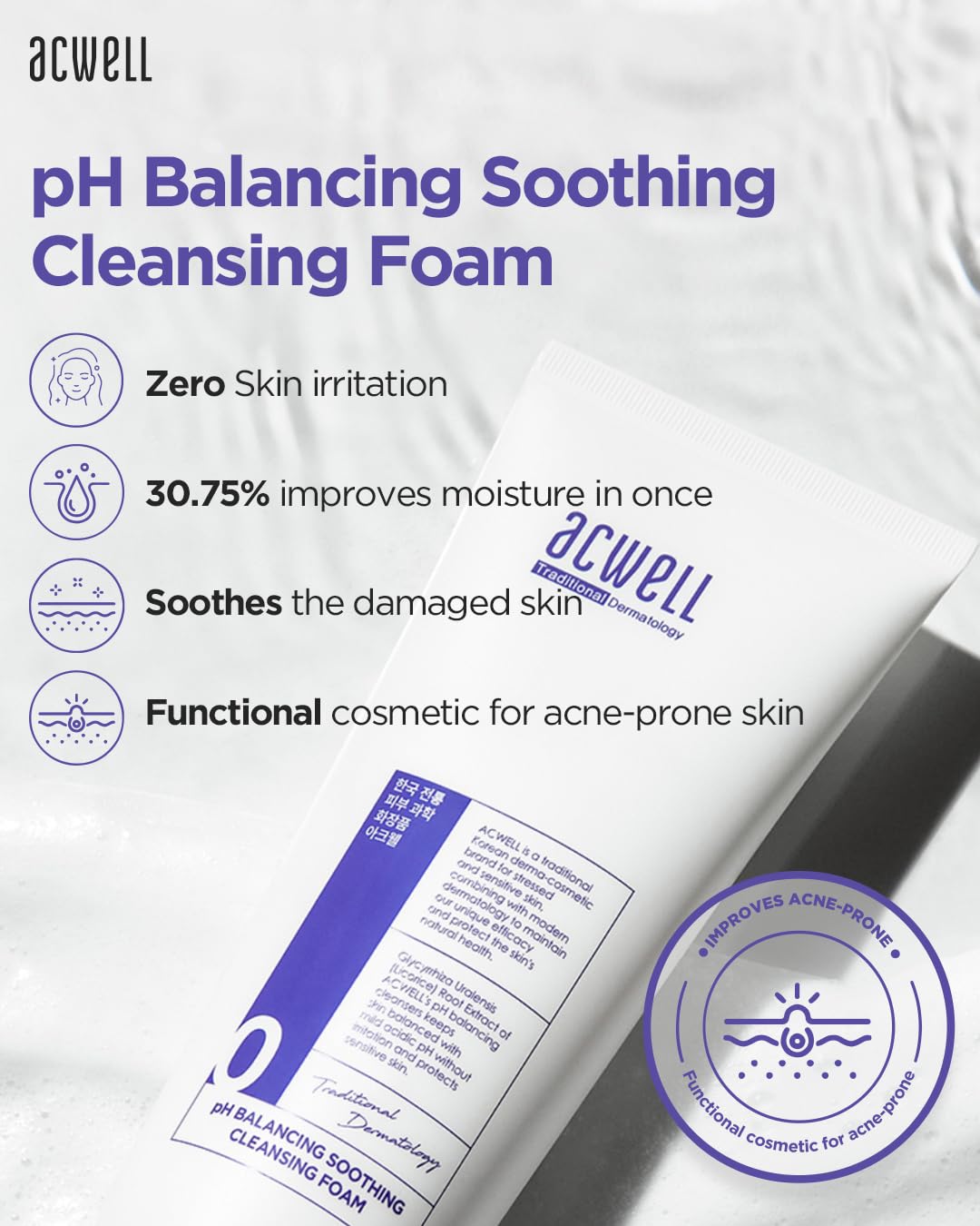 SKIN-SOOTHING FOAMING FACIAL CLEANSER: Acwell pH Balancing Soothing Cleansing Foam contains camphor leaf extracts, AHA, BHA, PHA and Licorice Extracts. This skin-calming blend helps soothe irritated and sensitive skin while deep cleansing the impurities from the pores. SEBUM CONTROL FACIAL CLEANSER: The exfoliating face wash contains pH balancing extracts for skin moisturizing effects. Acwell hydrating facial cleanser creates a dense and bubbly foam to control sebum and cleanse skin pores to give you soft, supple, and hydrated skin. MOISTURIZING AND HYDRATING FORMULA: This moisturizing face cleanser with licorice extract water effectively removes impurities from skin pores and keeps it purified. The gentle face cleanser pulls out the impurities from the skin and helps with moisturization and nourishment. IMPROVES SKIN VITALITY: This hydrating facial cleanser effectively nourishes the deepest layer of the skin. The nourishing ingredients in our gel cleanser effectively soothe irritated skin and encourage its strength and endurance, moisture replenishment to keep it dewy. EASY TO USE FACE CLEANSING GEL: Take an adequate amount of Acwell pH Balancing Soothing Cleansing Foam with a dry hand and gently massage the entire face to melt impurities. Add a small amount of water to get a dense foam and rinse off with lukewarm water. See more product details,SKIN-SOOTHING FOAMING FACIAL CLEANSER: Acwell pH Balancing Soothing Cleansing Foam contains camphor leaf extracts, AHA, BHA, PHA and Licorice Extracts. This skin-calming blend helps soothe irritated and sensitive skin while deep cleansing the impurities from the pores,SEBUM CONTROL FACIAL CLEANSER: The exfoliating face wash contains pH balancing extracts for skin moisturizing effects. Acwell hydrating facial cleanser creates a dense and bubbly foam to control sebum and cleanse skin pores to give you soft, supple, and hydrated skin,MOISTURIZING AND HYDRATING FORMULA: This moisturizing face cleanser with licorice extract water effectively removes impurities from skin pores and keeps it purified. The gentle face cleanser pulls out the impurities from the skin and helps with moisturization and nourishment,IMPROVES SKIN VITALITY: This hydrating facial cleanser effectively nourishes the deepest layer of the skin. The nourishing ingredients in our gel cleanser effectively soothe irritated skin and encourage its strength and endurance, moisture replenishment to keep it dewy,EASY TO USE FACE CLEANSING GEL: Take an adequate amount of Acwell pH Balancing Soothing Cleansing Foam with a dry hand and gently massage the entire face to melt impurities. Add a small amount of water to get a dense foam and rinse off with lukewarm water