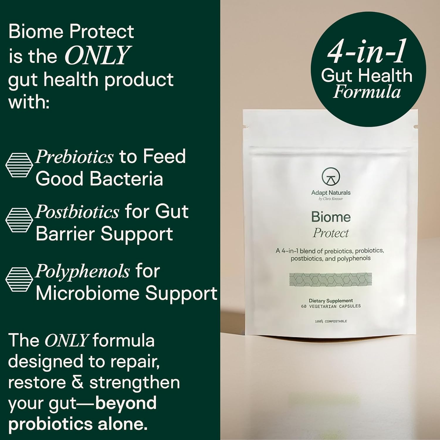 Powerful 4 - in - 1 Formula: Adapt Naturals' 4 - in - 1 blend of prebiotics, probiotics, postbiotics, and polyphenols nourishes the microbiome, supporting gut health and defense for both genders. Take two capsules daily for 30 - day supply of next - gen support