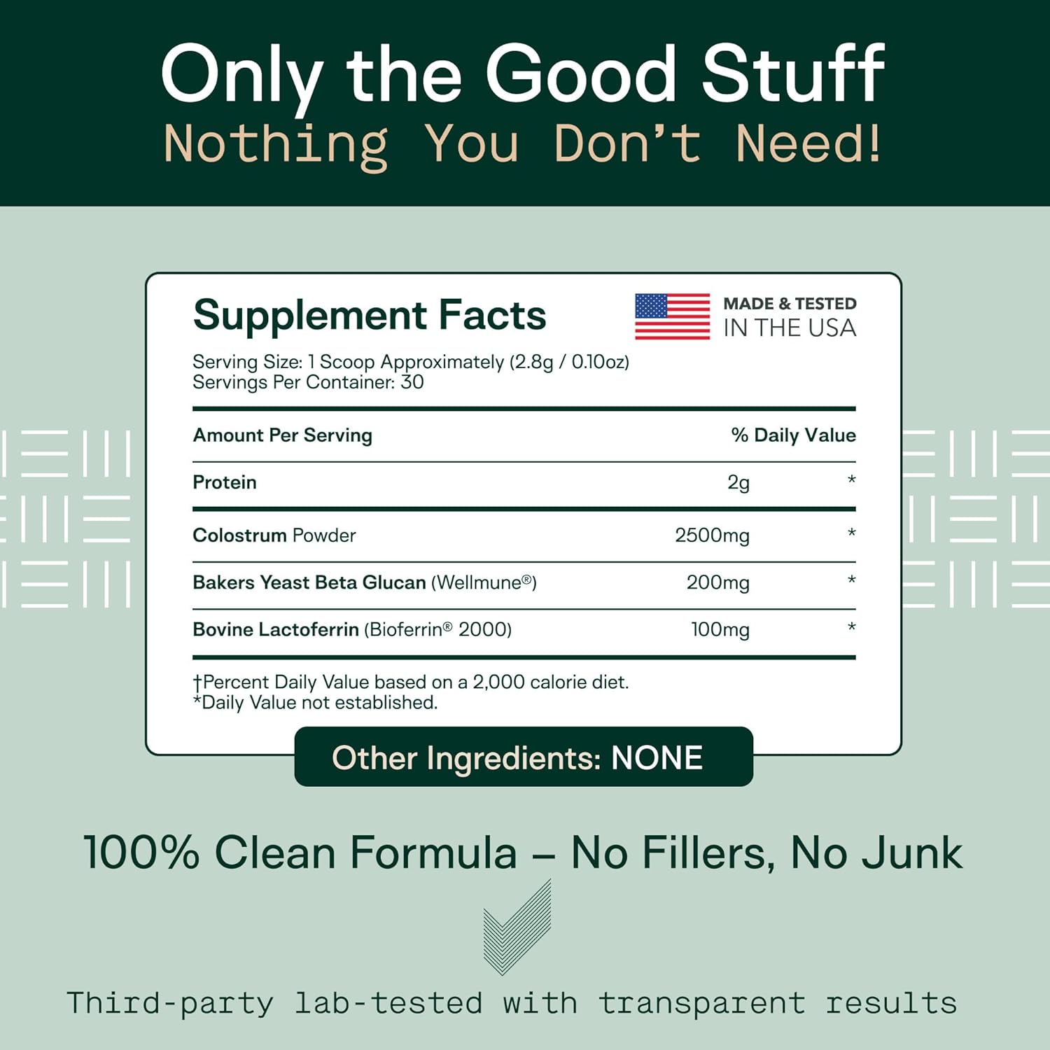 Adapt Naturals Grass-Fed Bovine Colostrum Supplement for men and women with Lactoferrin and Beta-Glucan. Discover the power of our Colostrum Powder, a premium colostrum supplement crafted for daily balance. Each serving contains 2.5 grams of cold-processed colostrum sourced from grass-fed cows, raised without antibiotics, hormones, or GMOs. This nutrient-rich colostrum is nature’s perfect first food, packed with essential nutrients, antibodies, growth factors, and bioactive compounds that support overall wellness. Our formulation features 200 mg of Wellmune beta-glucan, a natural polysaccharide known for its role in supporting immune health. Beta glucans supports the body’s natural immune response to recognize and respond quickly to threats, restoring balance to your immune system. We've included 100 mg of Bioferrin lactoferrin powder. This essential protein, naturally present in colostrum, plays a vital role in immune defense and gut health for men and women. It also contributes to normal iron metabolism and supports overall nutritional balance. Our bovine colostrum is designed for humans, making it an ideal choice for anyone seeking to enhance their health naturally. This powerful colostrum supplement is formulated to promote gut balance and immune system health, supporting your body’s natural protective functions. This powerful colostrum powder is your natural solution for enhanced immunity, gut health, and overall vitality. Elevate your wellness routine with our bovine colostrum,EVIDENCE-BASED, QUALITY INGREDIENTS: Adapt Naturals Bio-Avail grass fed colostrum with bovine lactoferrin and beta glucan powder - 2500mg of colostrum, 2.5x more than average, plus 100mg of lactoferrin and 200mg of beta glucan per serving,COLD-PROCESSED BENEFITS: Our Bio-Avail Colostrum+ features high IgG content compared to the average colostrum supplement and is cold-processed to preserve the fragile immunoglobulins and other essential nutrients,HEALTH & WELLNESS: Formulated to complement a healthy lifestyle, including digestive balance and immune function. Restore your 'inner glow' by nourishing your skin, hair, and nails, and promote enhanced vitality for a more youthful and radiant appearance,PURE & CLEAN SOURCING: Sourced from grass-fed, pasture-raised cows in the U.S., our cold-processed bovine colostrum for women and men is free from antibiotics, hormones or GMOs, ensuring purity and potency,HOW TO USE: Take 1 scoop of bovine colostrum powder per day (measuring scoop included) by mixing it with 6-8 ounces of room-temperature water and drinking it on an empty stomach, i.e. 30 minutes before a meal