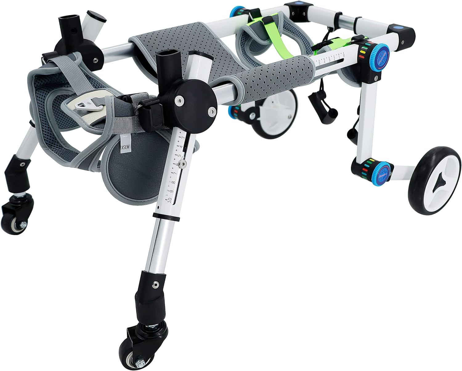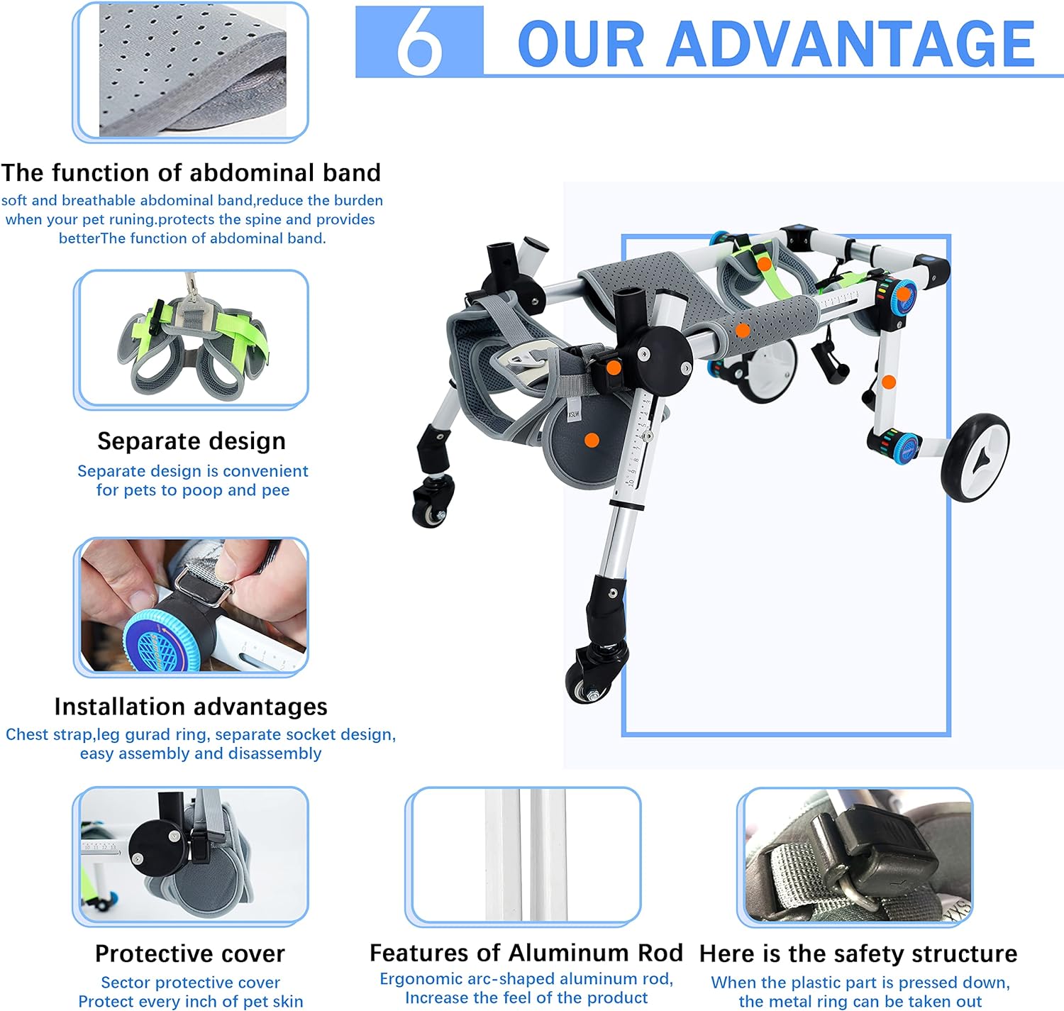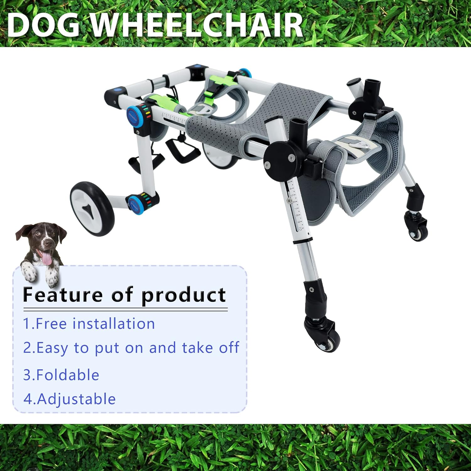 [Heart-warming design]: Pets will be troubled by inconvenient movement in life.Long-term inability to exercise will affect of the pet and reduce his confidence. Our PET WHEELCHAIR is designed to help pets with INJURED OR DISABLED HIND LEGS to walk, run and play freely, help them return to normal life10[Features of the product]: The height, width and length of this PET WHEELCHAIR can be adjusted, and it can adapt to your pet within a certain range. The whole product is easy to assemble, you can install it yourself, and the foldable design is more convenient to carry. The buckle design can hang the tow rope on the buckle to avoid losing pets, which is very convenient10[Materials and characteristics used]: light and strong, DOG WHEELCHAIR has high hardness and light weight, which can ensure the overall strength of the wheelchair, and the strap material is soft and will not hurt pets10[Note]: 4 wheel FOLDING WHEELCHAIRS are only suitable for pets with disabled hind legs full support pet wheelchair. If your dog is seriously injured, we recommend that you go to the veterinary hospital for help as soon as possible. I wish your pet a speedy recovery!10[Friendly Tips]: Please measure your dog before buying. Pets are one of our family members. If they are disability, please don't give up. A WHEELCHAIR may give them a second life. I wish your pet a speedy recovery!