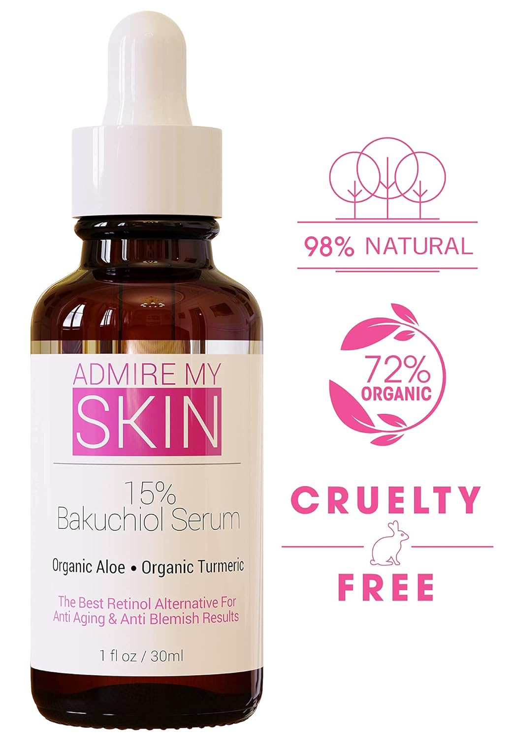 Admire My Skin Bakuchiol Serum Natural Retinol Serum Alternative For Face – Anti Blemish Anti Aging Facial Serum Contains Organic Aloe + Turmeric 1Oz