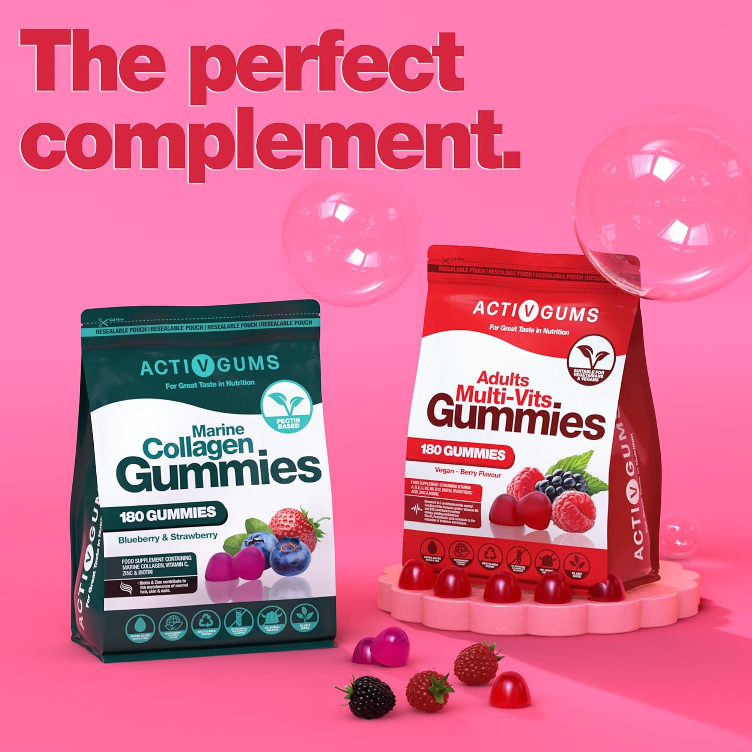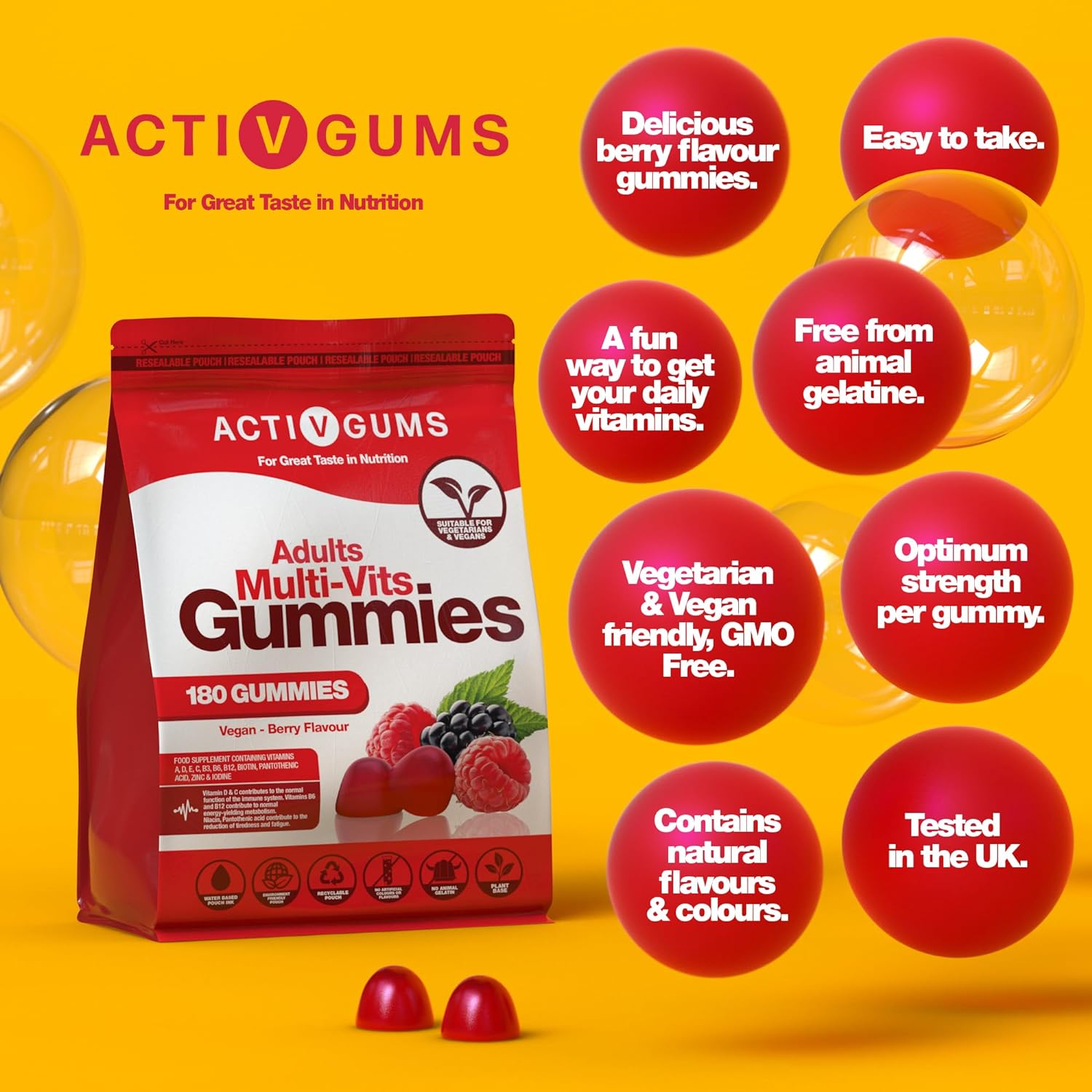 DESCRIPTION : Adults Multi 180 Vegan Gummies. Resealable & Recyclable Pouch. Contains All 11 Essential Vitamins & Minerals A,D,E,C,B3,B6,B5,B12,Biotin,Zinc&Iodine. Suitable for Vegans & Vegetarians by ActivGums®