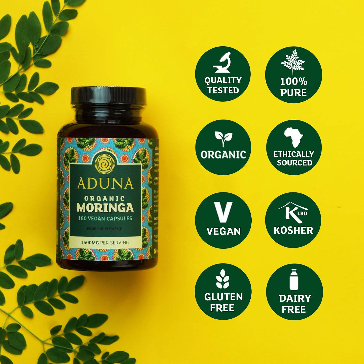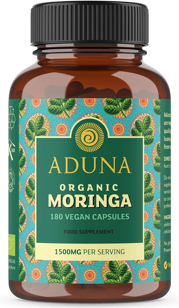 About this item ON-THE-GO SUPERFOOD: Made using 100% organic moringa powder. An easy way to enjoy the benefits of reducing fatigue, supporting healthy skin and immune function. Rich in fibre and plant protein. WHY ADUNA MORINGA: Only the highest quality leaves from moringa oleifera trees are selected. Our work with rural communities provide year-round source of income, ensuring every purchase makes a good impact. VEGAN, ORGANIC & SUSTAINABLE: Our moringa leaf capsules is certified by the Soil Association and EU compliant. Gluten-free and dairy-free with no added sugar or preservatives to make for pure moringa capsules. STRONG FORMULA: Each moringa oleifera capsule is a source of 5 essential nutrients. Take up to 3 capsules daily with food; each bottle comes with 2 months’ supply. MORINGA FOR BREASTFEEDING: Moringa is scientifically proven to increase breast milk supply to help give mum a boost. Try as a moringa lactation supplement. See more product details,ON-THE-GO SUPERFOOD: Made using 100% organic moringa powder. An easy way to enjoy the benefits of reducing fatigue, supporting healthy skin and immune function. Rich in fibre and plant protein,WHY ADUNA MORINGA: Only the highest quality leaves from moringa oleifera trees are selected. Our work with rural communities provide year-round source of income, ensuring every purchase makes a good impact,VEGAN, ORGANIC & SUSTAINABLE: Our moringa leaf capsules is certified by the Soil Association and EU compliant. Gluten-free and dairy-free with no added sugar or preservatives to make for pure moringa capsules,STRONG FORMULA: Each moringa oleifera capsule is a source of 5 essential nutrients. Take up to 3 capsules daily with food; each bottle comes with 2 months’ supply,MORINGA FOR BREASTFEEDING: Moringa is scientifically proven to increase breast milk supply to help give mum a boost. Try as a moringa lactation supplement
