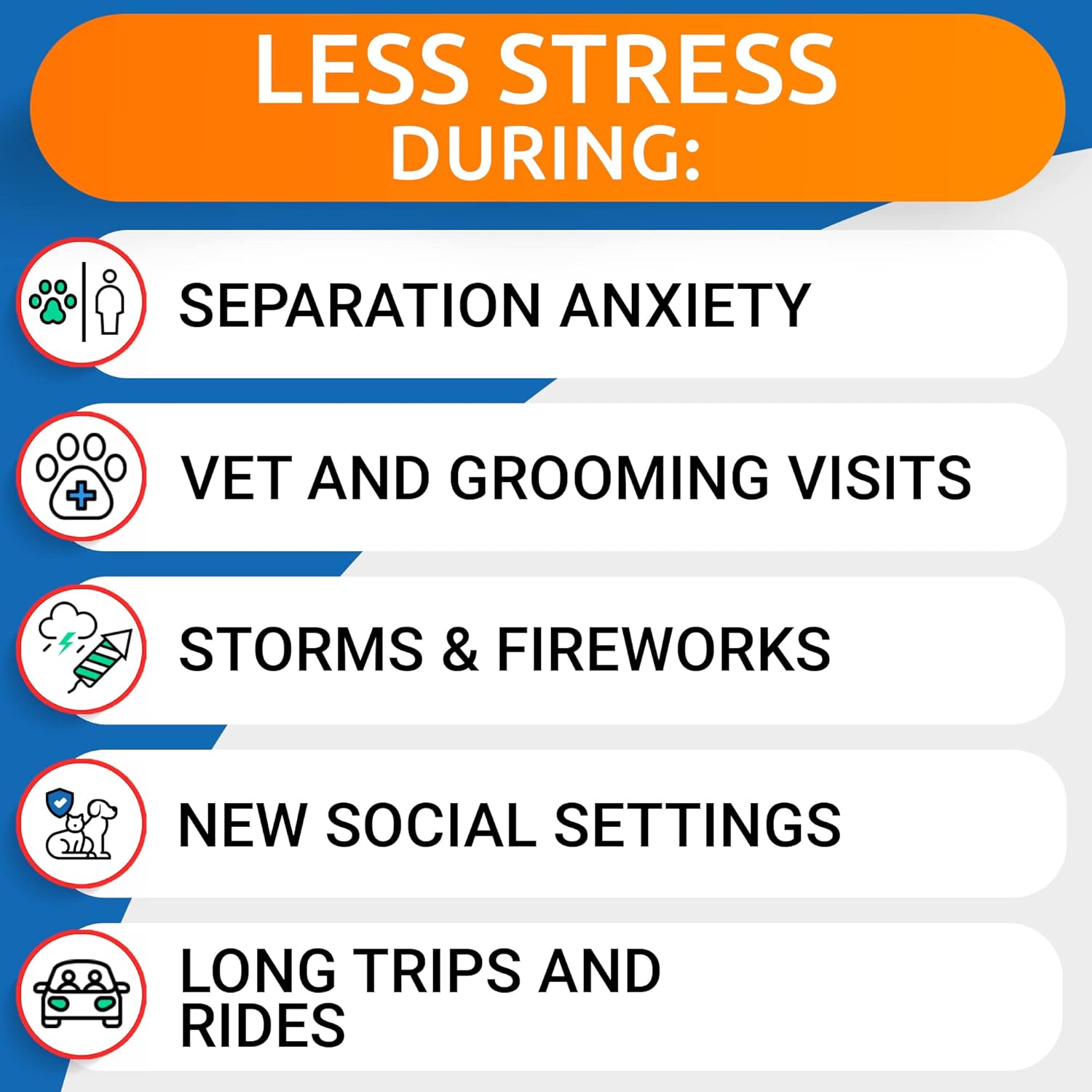 Moderate Anxiety And Stress - These Calming Treats Help Reduce Symptoms Of Anxiety Or Stress Such As Growling, Barking, Scratching, Chewing, Licking, Uncontrolled Urination Etc. Anti-Anxiety Treats Can Be Used Keep Your Pet Cool, Calm And Collected During Separation, Car Rides, Vet Visits, Thunders, Firework Etc