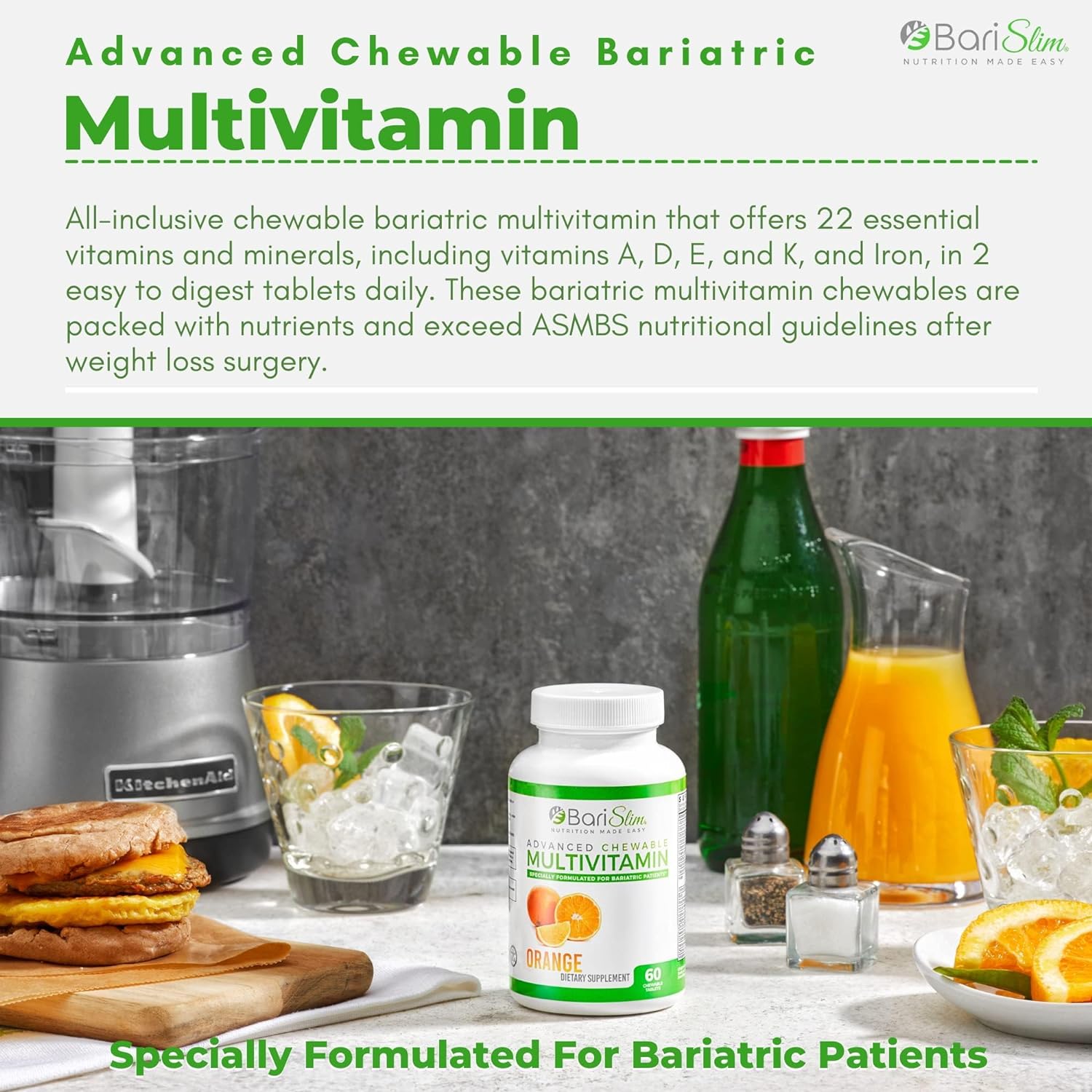 ??Comprehensive Post-Bariatric Support?: BariSlim's Advanced Chewable Bariatric Multivitamin Tablets are expertly crafted to provide comprehensive nutritional support following bariatric surgery, catering to the needs of gastric bypass and gastric sleeve patients. These chewable tablets ensure your body receives essential nutrients during the crucial post-surgery phase??Delicious Orange Flavor?: Make daily supplementation a delight with our orange-flavored chewable tablets. Say goodbye to the struggle of swallowing large pills. These delicious tablets transform your regimen into a pleasurable experience, helping you stay committed to your post surgery nutrition??All-in-One Nutrient Solution?: BariSlim's tablets offer a precise blend of essential vitamins and minerals, simplifying your daily bariatric supplements routine. Just two chewable multivitamin tablets deliver complete nutritional coverage, promoting overall health and well-being. Trust us to provide you with a convenient and effective way to meet your daily nutritional requirements??Optimal Nutrient Absorption?: We prioritize your well-being with bariatric vitamins designed for efficient absorption. Your body can efficiently utilize these nutrients, ensuring you get the maximum benefits. This aspect is crucial for your post-bariatric surgery journey, and we are committed to providing the support you need??Trusted Quality Assurance?: When it comes to bariatric supplements, BariSlim stands out as a brand committed to excellence and your health. We comprehend the unique nutritional demands post-surgery, and our multivitamin is a testament to that understanding. Trust in a brand that is dedicated to your journey to a healthier, post-bariatric life—trust BariSlim