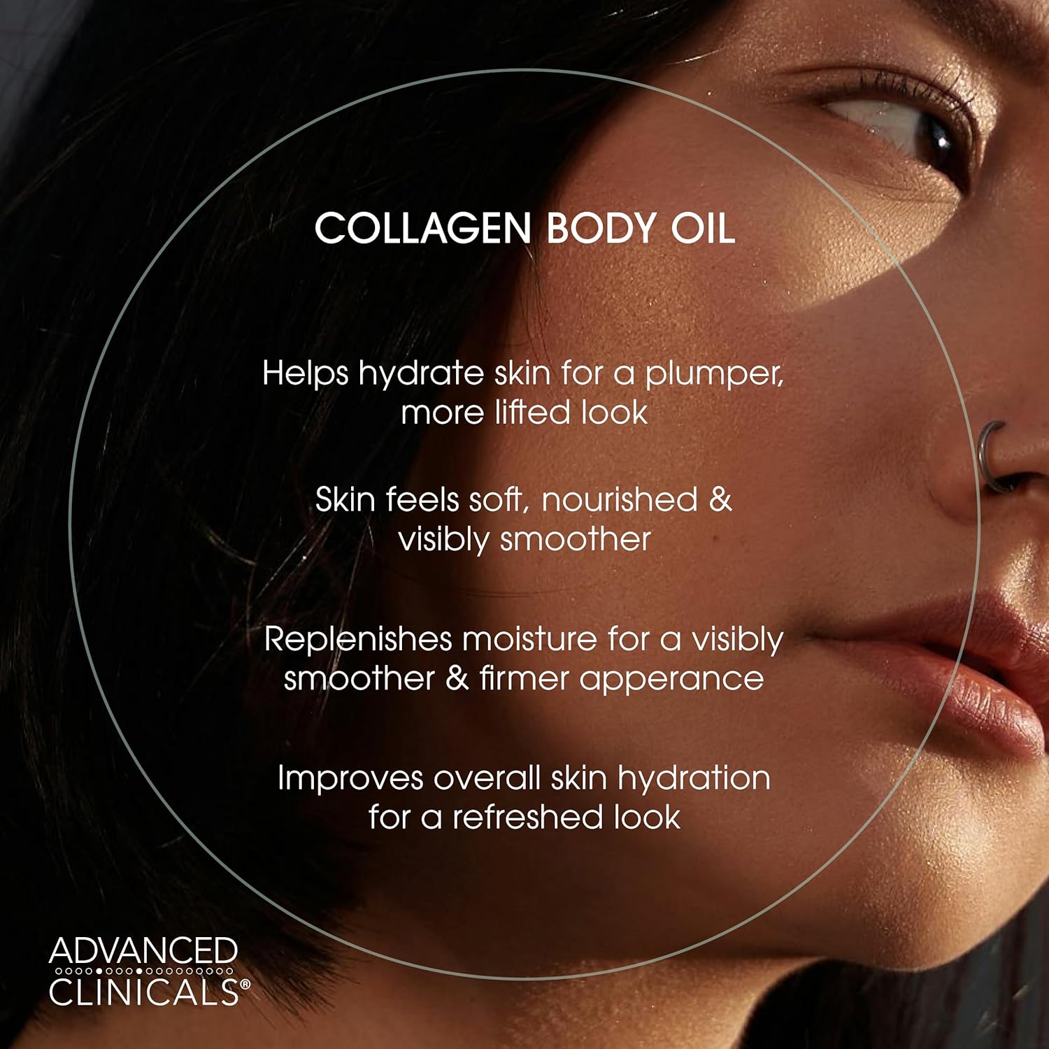 About this item COLLAGEN BODY OIL HYDRATES FOR A SMOOTHER & FIRMER LOOKING SKIN TONE – This nourishing body oil hydrates to visibly improve the look of skin texture while visibly restoring radiance to dry, dull areas. Skin feels soft, supple, and visibly refreshed with a healthy-looking glow. Formulated by Cosmetic Chemists for women and men who are looking to improve overall skin hydration. COLLAGEN BODY OIL WITH VITAMIN E, BOTANICALS, & VITAMIN C - Hydrates and nourishes while helping to visibly firm and smooth the look of skin. This antioxidant-rich blend supports a more even-looking tone and enhances skin’s softness and radiance. LIGHTWEIGHT OIL FOR SILKY, SMOOTHER LOOKING SKIN - This luxurious yet lightweight body oil glides over skin to help lock in moisture and visibly smooth texture. Skin feels nourished, supple, and hydrated after each use. Ideal for anyone who is looking to enhance their skincare beauty routine. IDEAL FOR DRY, DEHYDRATED LOOKING SKIN - Recommended for daily use to help hydrate and smooth. Apply to dry or damp skin, massaging until fully absorbed. Apply to skin as needed. SCIENCE-BACKED SKINCARE – Advanced Clinicals offers science-driven formulas featuring well known and proven ingredients. Formulated by our in-house R&D team, with over 25 years of skincare expertise, Advanced Clinicals products are dermatologist tested and formulated with your skincare goals in mind. Made in the Midwest with globally sourced materials. See more product details,COLLAGEN BODY OIL HYDRATES FOR A SMOOTHER & FIRMER LOOKING SKIN TONE – This nourishing body oil hydrates to visibly improve the look of skin texture while visibly restoring radiance to dry, dull areas. Skin feels soft, supple, and visibly refreshed with a healthy-looking glow. Formulated by Cosmetic Chemists for women and men who are looking to improve overall skin hydration,COLLAGEN BODY OIL WITH VITAMIN E, BOTANICALS, & VITAMIN C - Hydrates and nourishes while helping to visibly firm and smooth the look of skin. This antioxidant-rich blend supports a more even-looking tone and enhances skin’s softness and radiance,LIGHTWEIGHT OIL FOR SILKY, SMOOTHER LOOKING SKIN - This luxurious yet lightweight body oil glides over skin to help lock in moisture and visibly smooth texture. Skin feels nourished, supple, and hydrated after each use. Ideal for anyone who is looking to enhance their skincare beauty routine,IDEAL FOR DRY, DEHYDRATED LOOKING SKIN - Recommended for daily use to help hydrate and smooth. Apply to dry or damp skin, massaging until fully absorbed. Apply to skin as needed,SCIENCE-BACKED SKINCARE – Advanced Clinicals offers science-driven formulas featuring well known and proven ingredients. Formulated by our in-house R&D team, with over 25 years of skincare expertise, Advanced Clinicals products are dermatologist tested and formulated with your skincare goals in mind. Made in the Midwest with globally sourced materials
