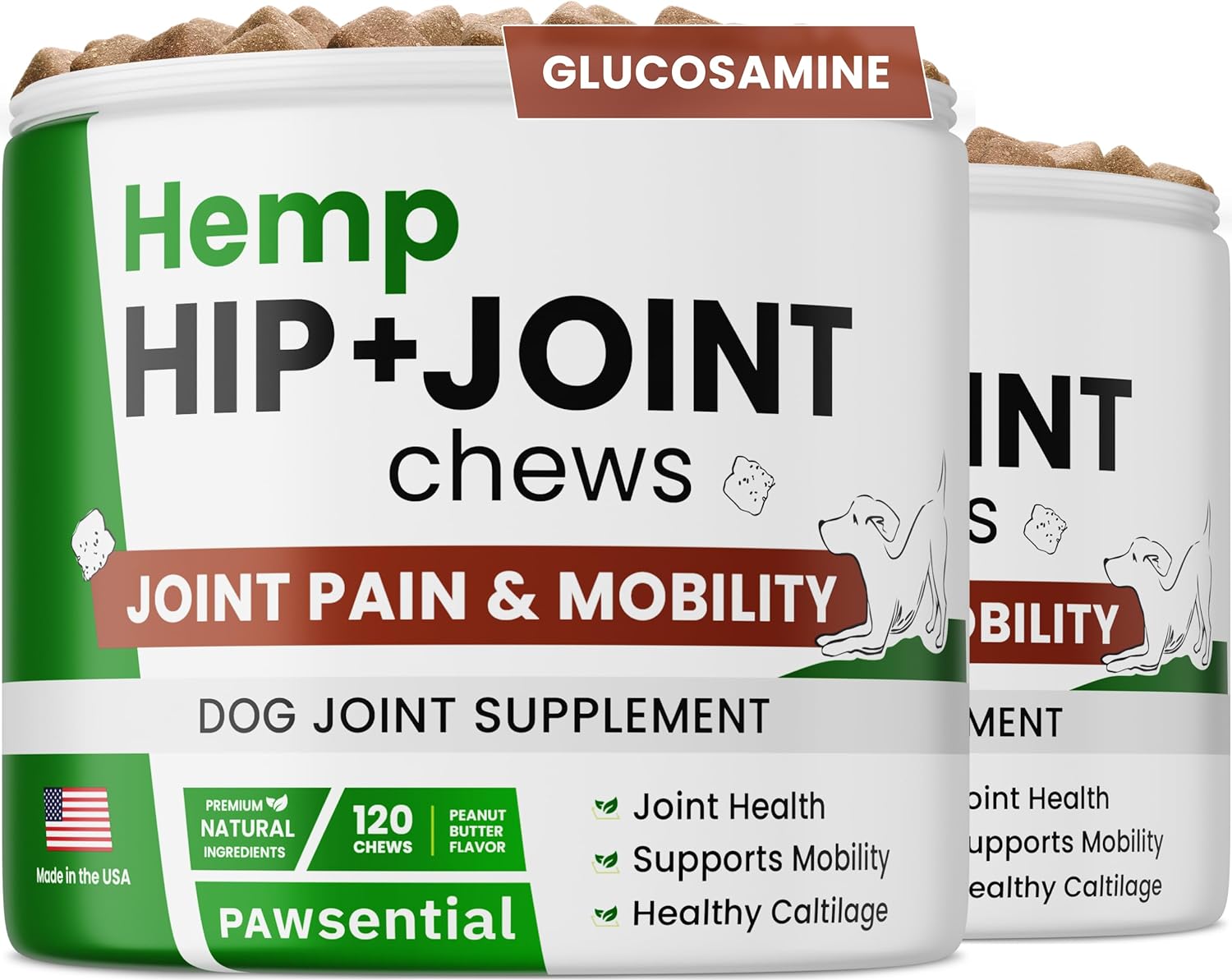 Hemp Chews for Dogs Hip and Joint Pain Relief – Our advanced hemp joint supplement for dogs with glucosamine chondroitin aid joint health and ease arthritis pain. Plus, our soft chews have hemp oil and MSM for anti-inflammatory benefits10PAWSential 90-Day Trusted Guarantee – If you and your fur baby aren’t totally happy with our hemp hip and joint chews for dogs, contact us for a prompt refund. No questions asked. We're sure your pet will love our joint pain relief supplements10Extra Benefits for Senior Dogs – Our advanced hemp glucosamine for dogs hip and joint supplement helps older pups with joint pain. It's a safe & effective way to promote flexibility, mobility, and extend your adult or old pet’s active life10Small, Easy-to-Take Chews – Our delicious hemp dog treats for joints are 2.5g. It's the perfect chewable dog joint supplement large breed, medium, and small-breed dogs will love. No hassle for you or your doggie10Locally Made in the U.S.! – Our chewables produced locally from natural ingredients to support your pet's bone, joint & hip health. It’s the Pawsential way of care. And did we mention, unlike pills, capsules, or tablets, they're easy to take